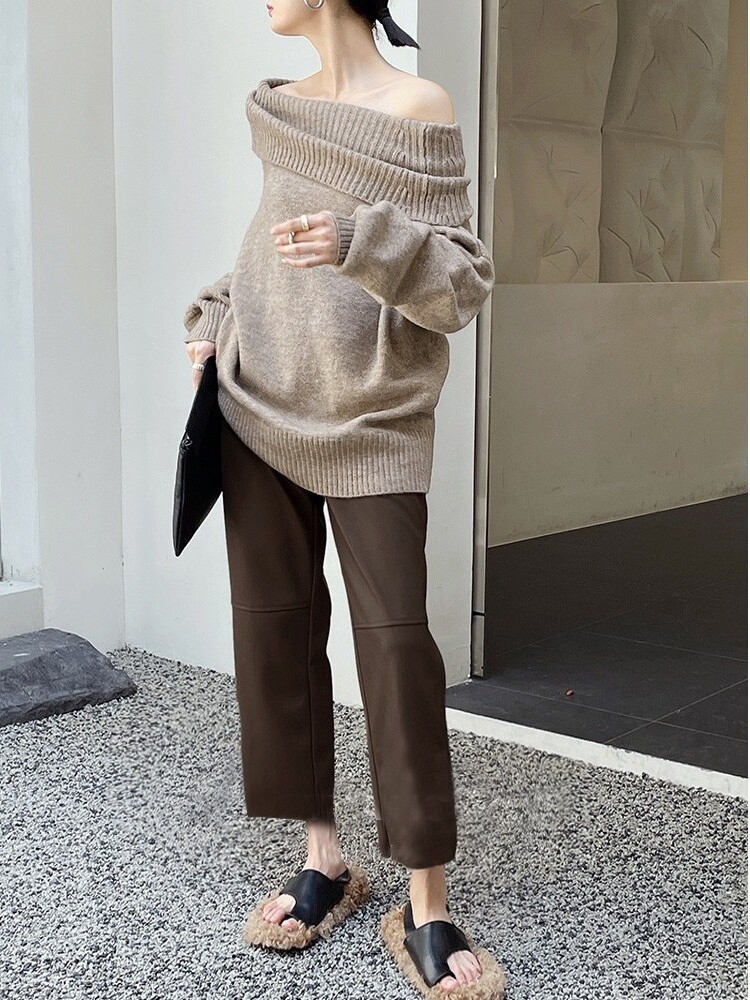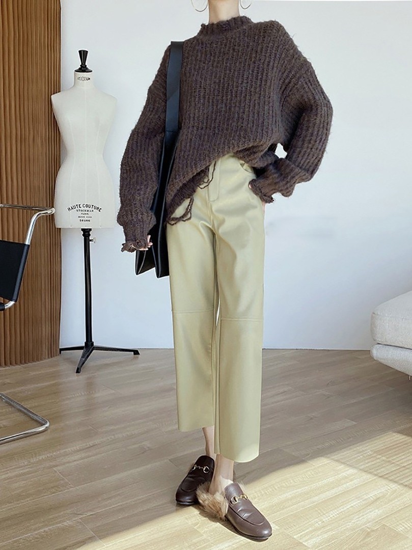 促销 宽松高腰通勤简约女休闲裤 柔软绵羊皮皮裤 新款 真皮皮裤 特价