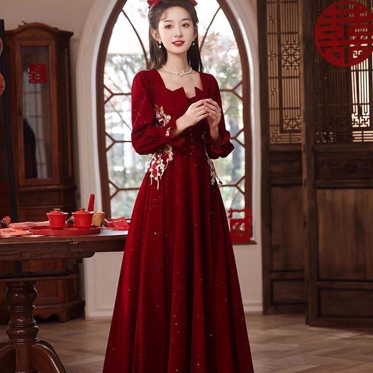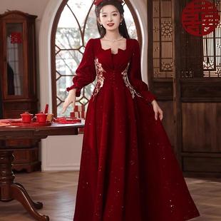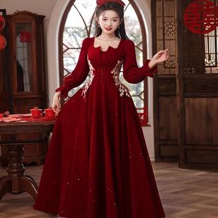 在逃公主订婚裙女 高级感结婚礼服长袖 丝绒大码 敬酒服新娘秋冬新款