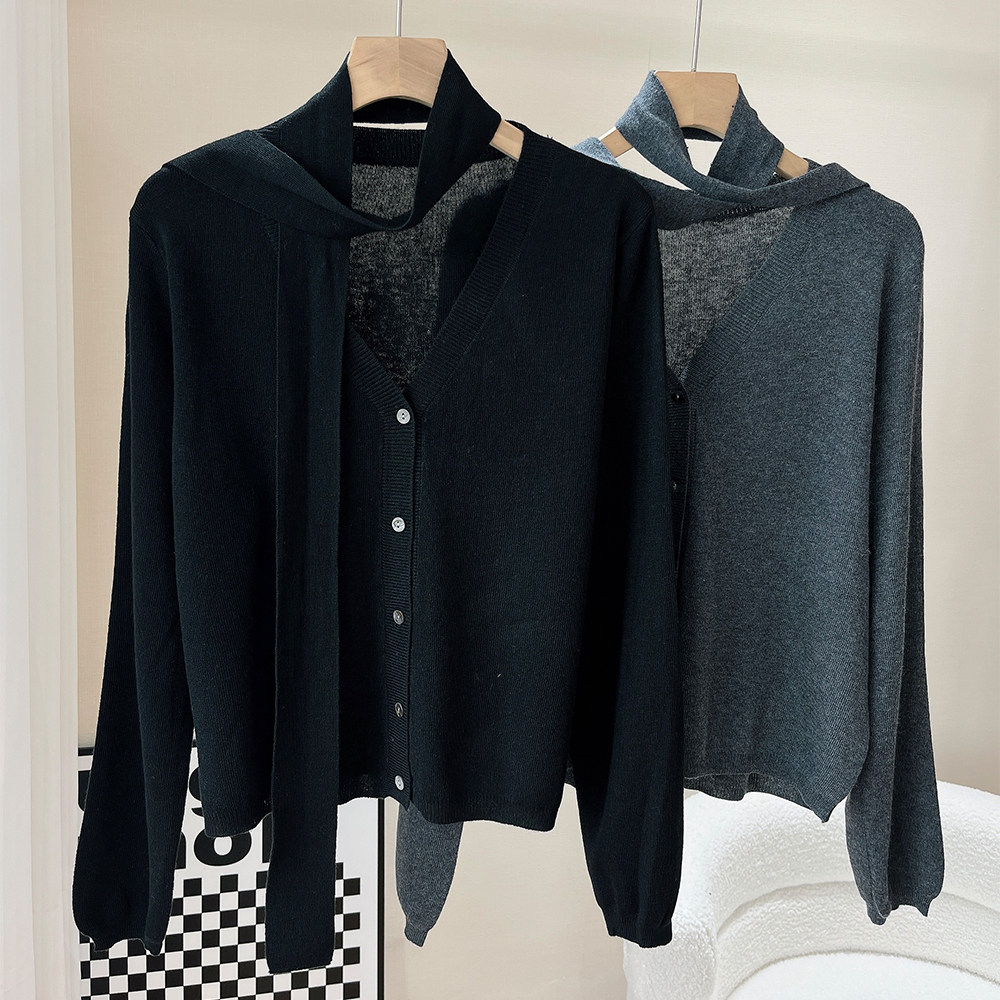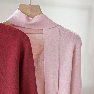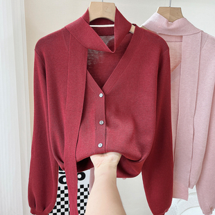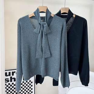V领外穿长袖 开衫 毛衣绑带宽松纯色设计感 飘带羊绒混纺针织衫 法式