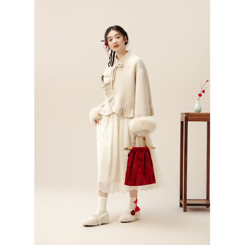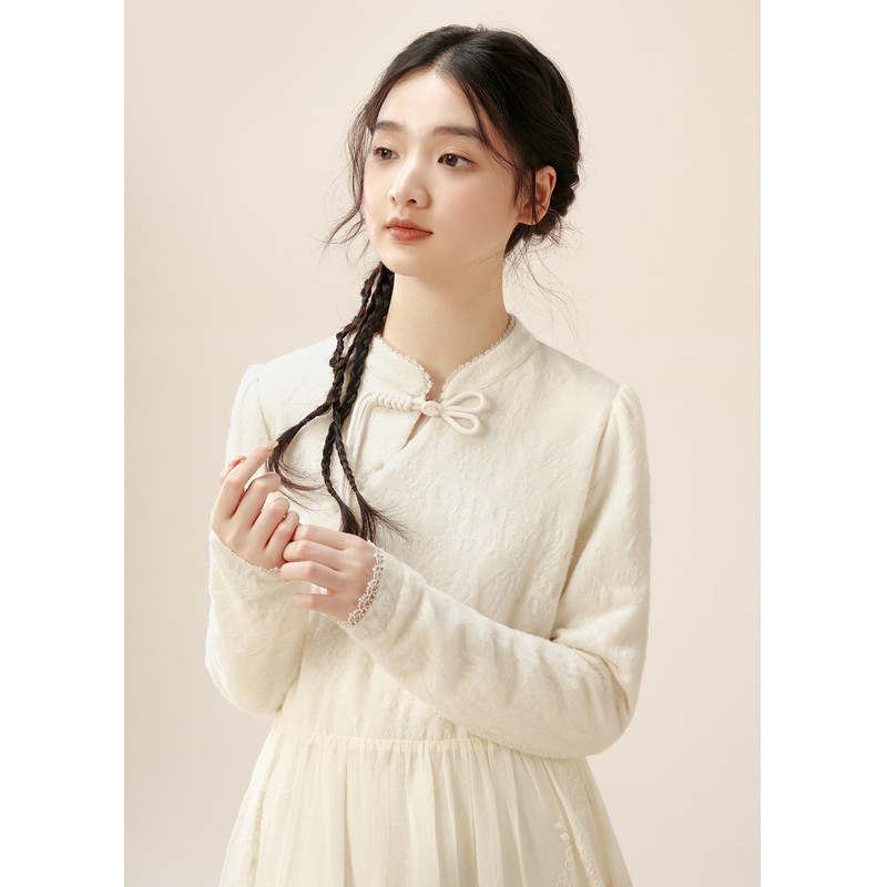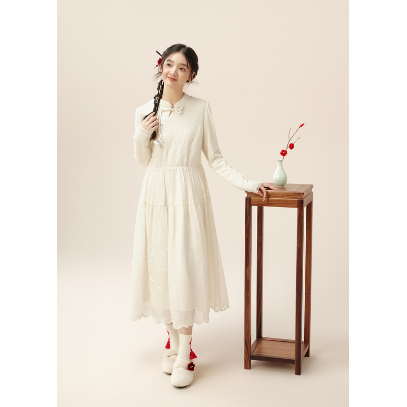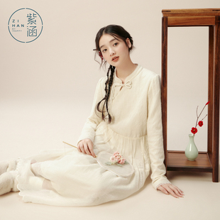 重工刺绣收腰a字裙 新款 紫涵新中式 立领斜襟盘扣羊毛连衣裙女冬季