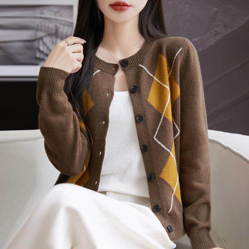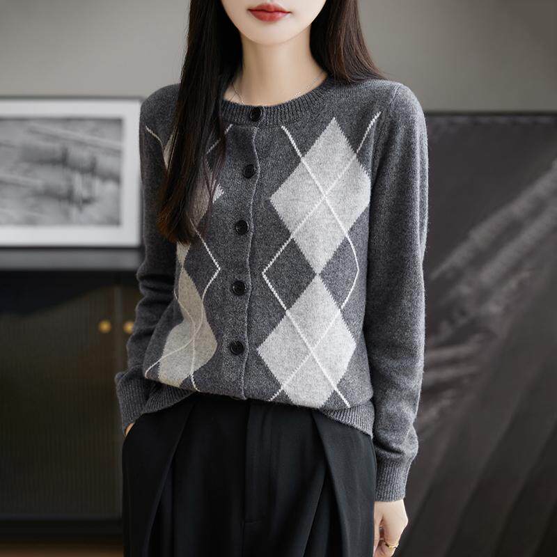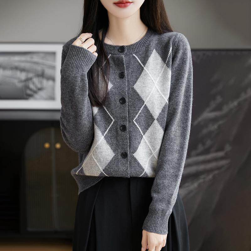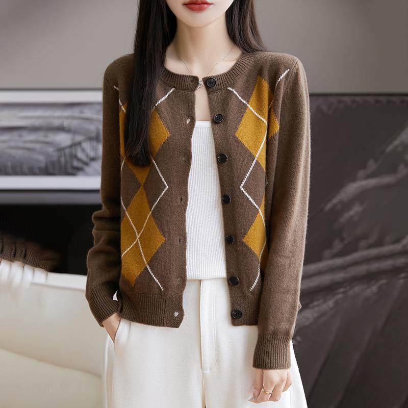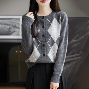 上衣 女圆领菱形拼色针织外套毛衣宽松羊绒衫 秋冬季 100%纯羊毛开衫