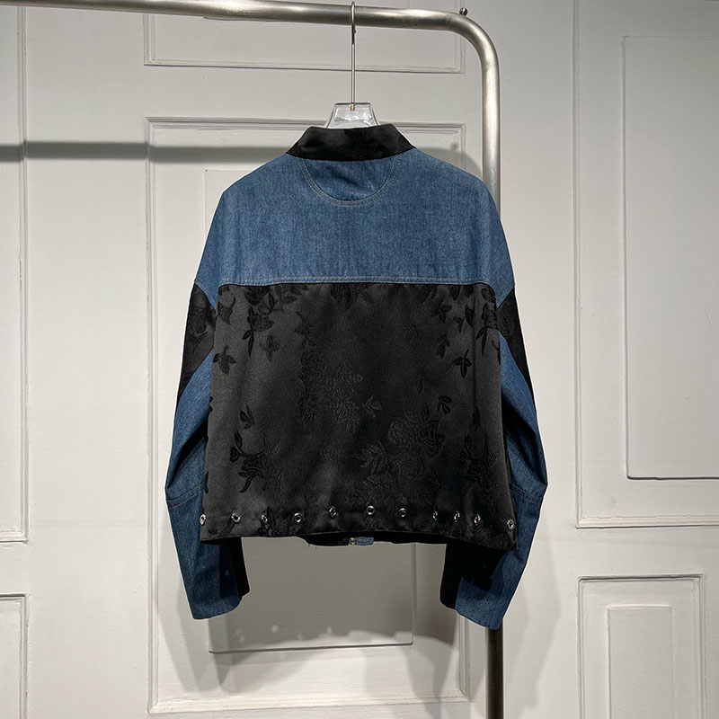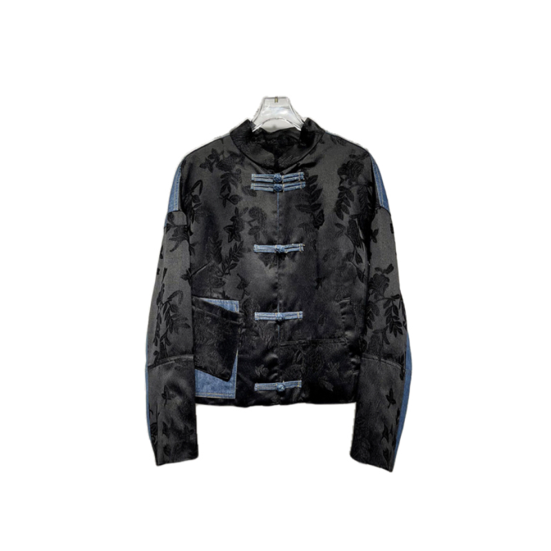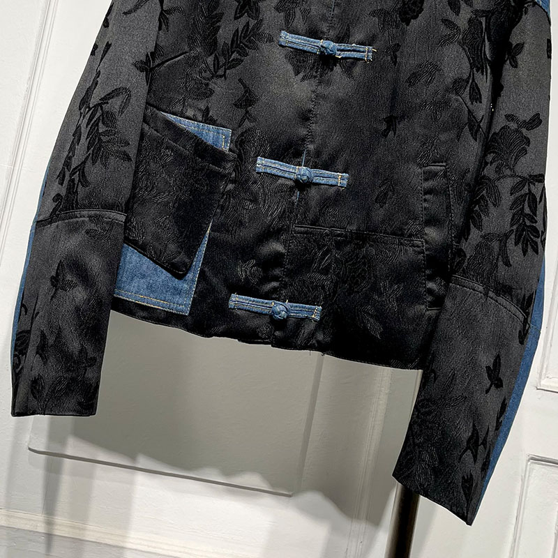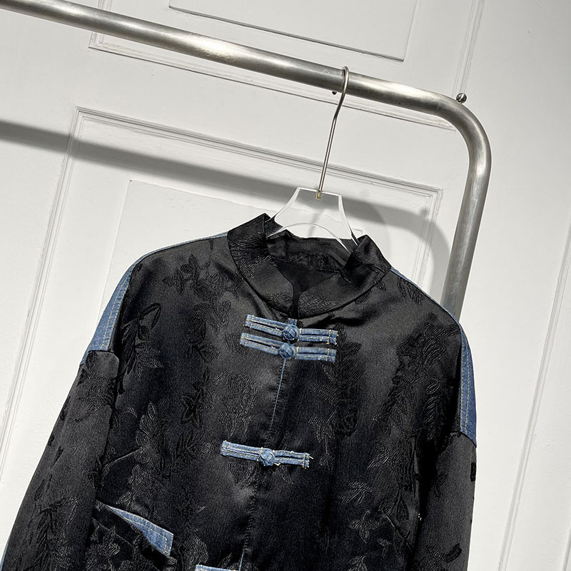 宽松显瘦气质百搭上衣 新款 新中式 立领拼牛仔盘扣短外套女2023秋季