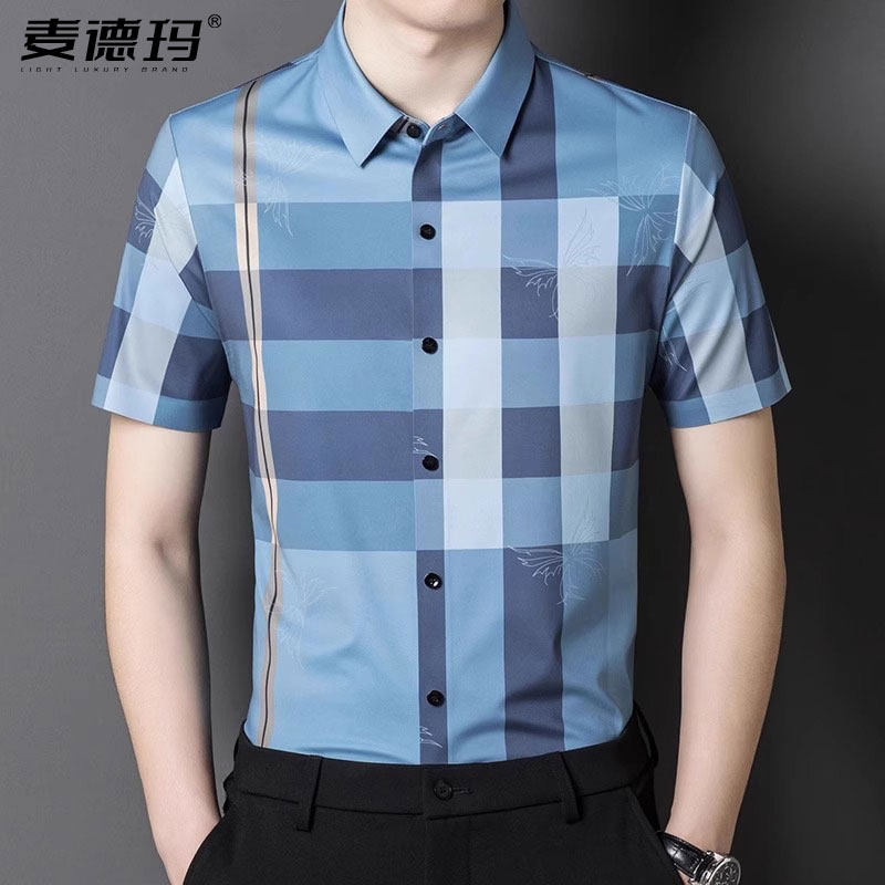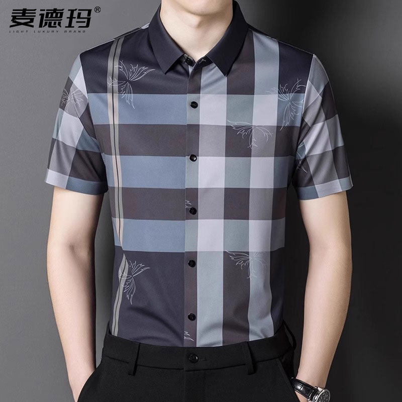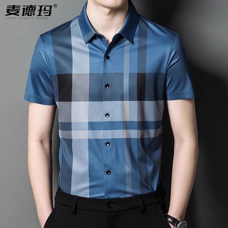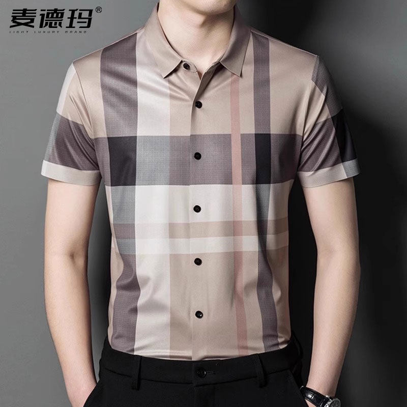 舒适轻薄款 短袖 夏季 高端男装 舒适 冰丝格子花衬衫 中年寸衣新款 男士