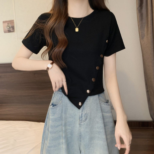设计感不规则斜扣打底衫 上衣女夏季 胖妹妹显瘦遮肚子正肩短袖 大码