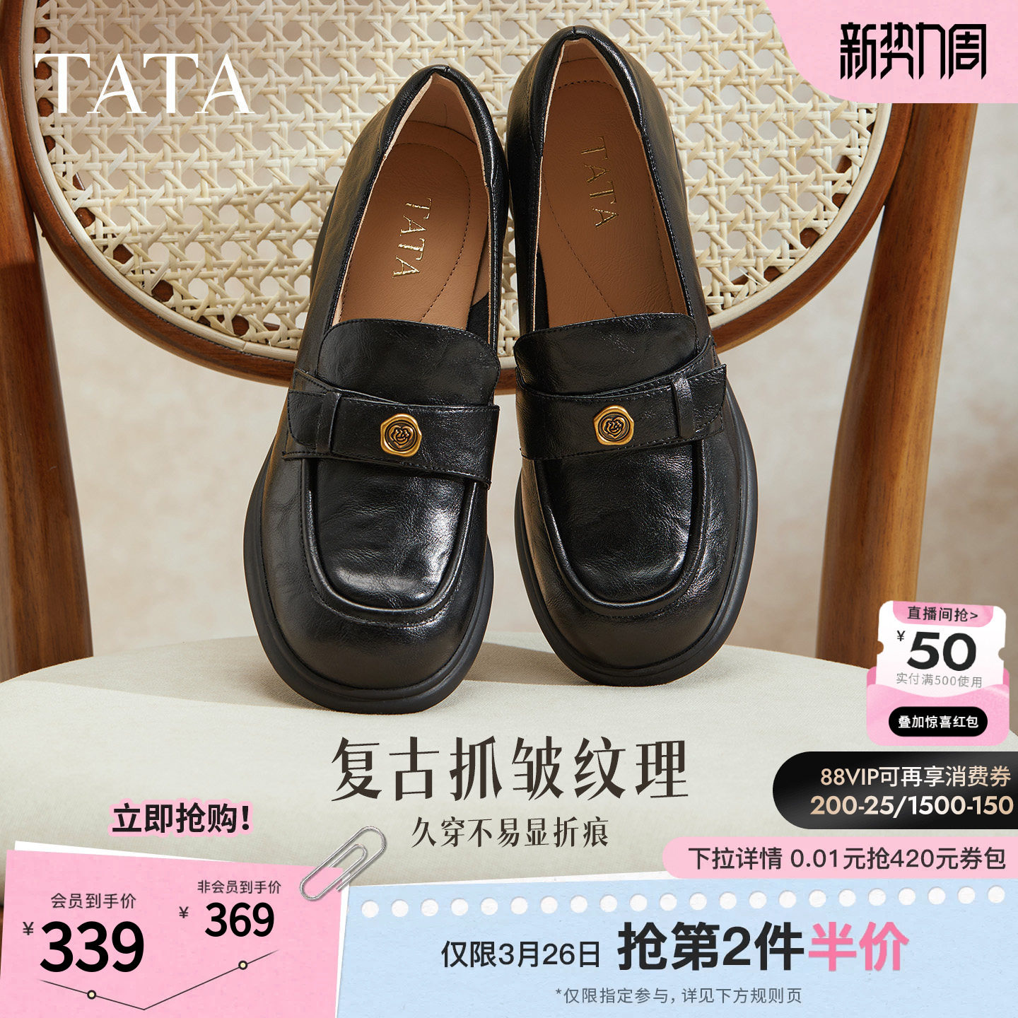 通勤皮鞋 TATA他她粗跟英伦乐福鞋 新款 浅口高跟单鞋 7A524AA5 女鞋