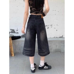 休闲显瘦阔腿牛仔中裤 黑色破洞直筒牛仔七分裤 宽松大码 时尚 女夏季