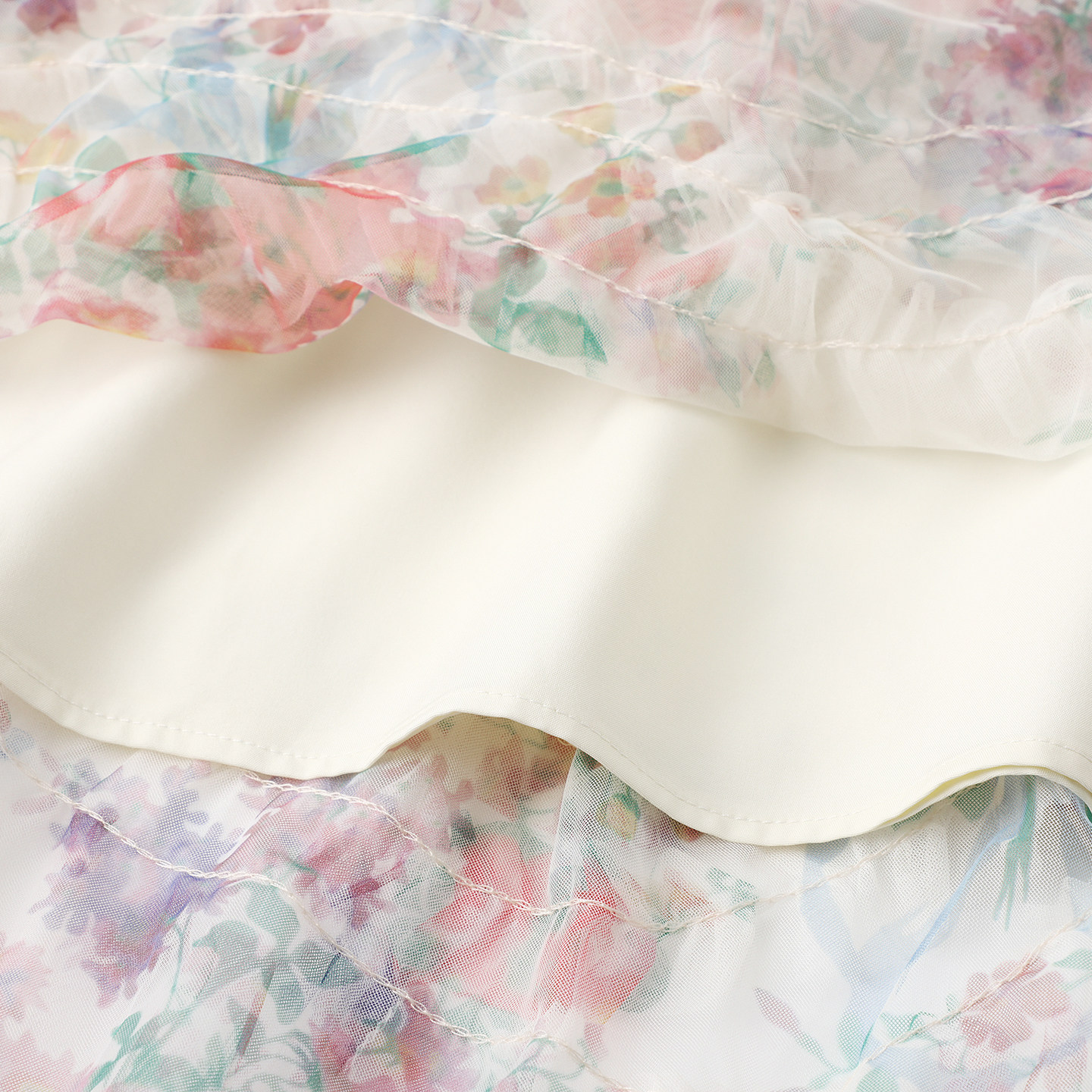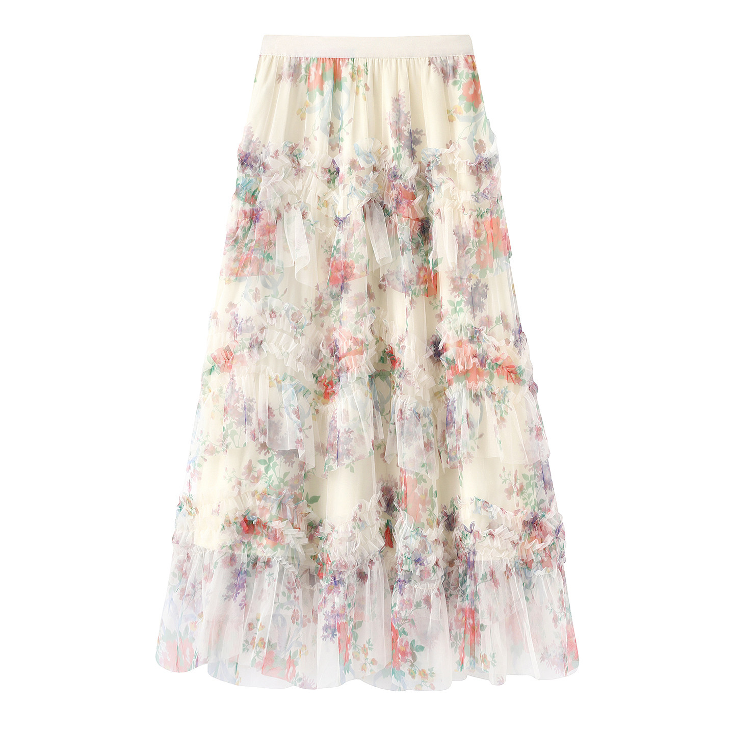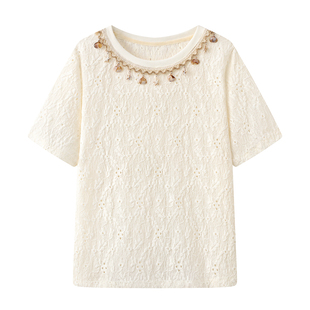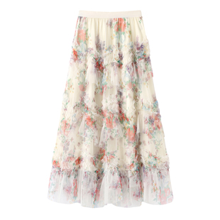 高腰显瘦碎花网纱半身裙女 T恤 一套入 重工镂空刺绣钉珠圆领短袖