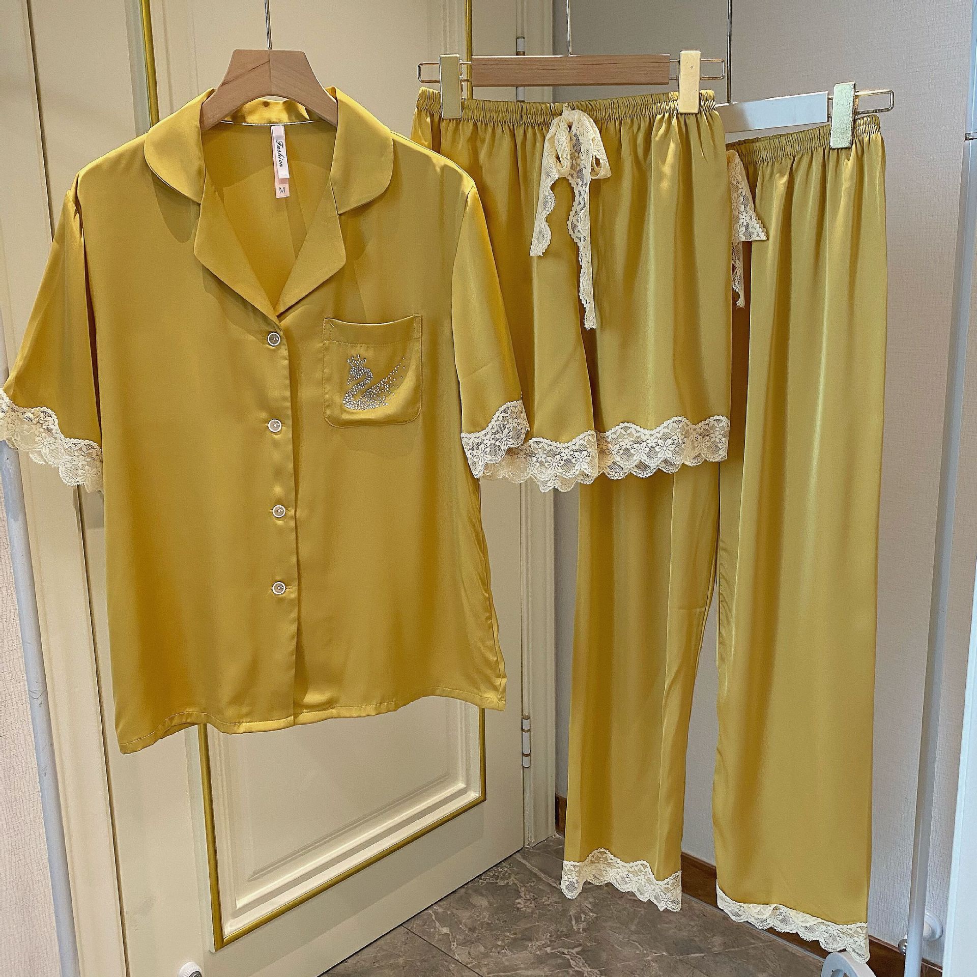 睡衣女夏季 三件套烫钻丝绸家居服套装 网红冰丝短袖 带长裤 短裤 薄款