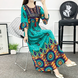 复古民族风长裙流苏高腰大摆裙子碎花棉绸连衣裙波西米亚沙滩裙