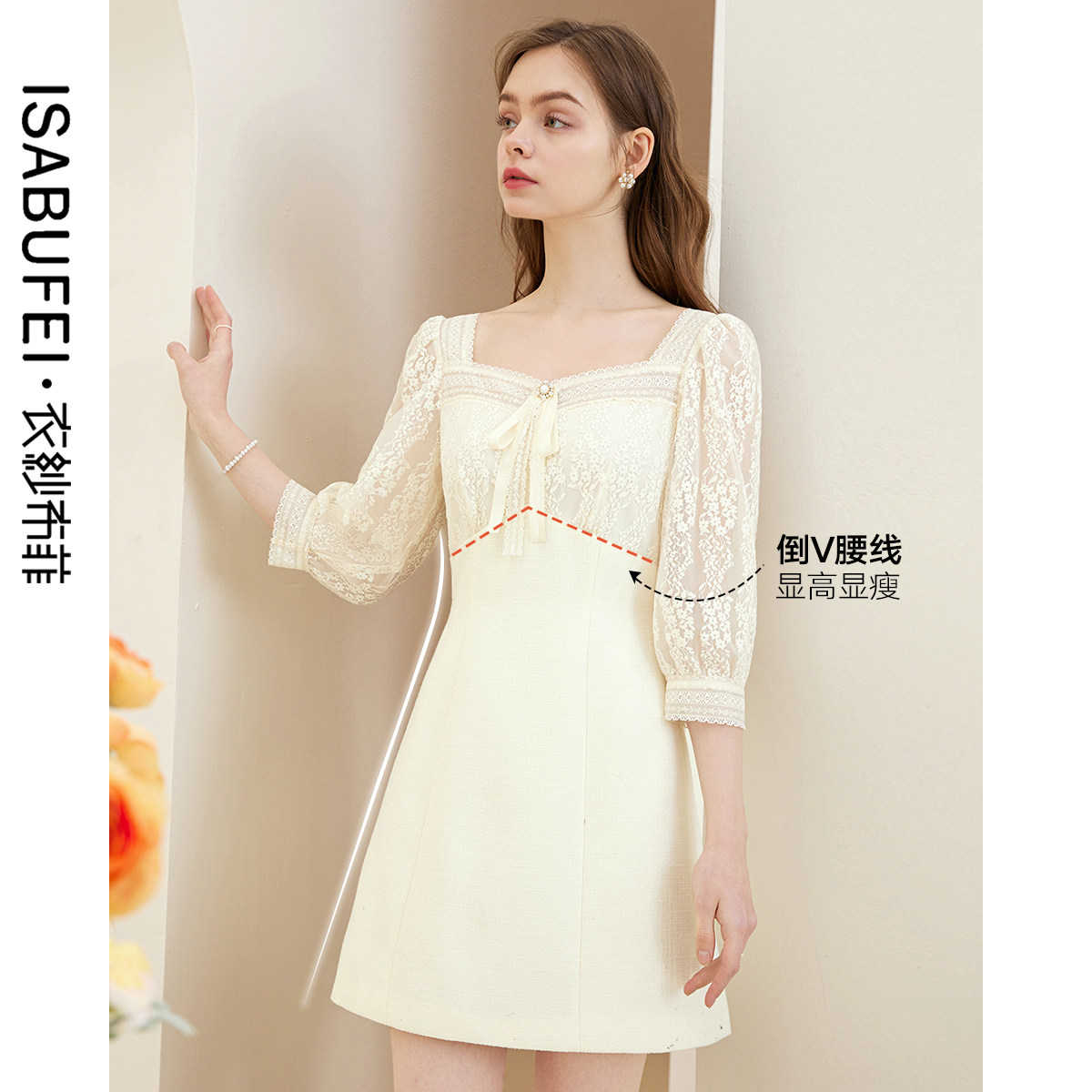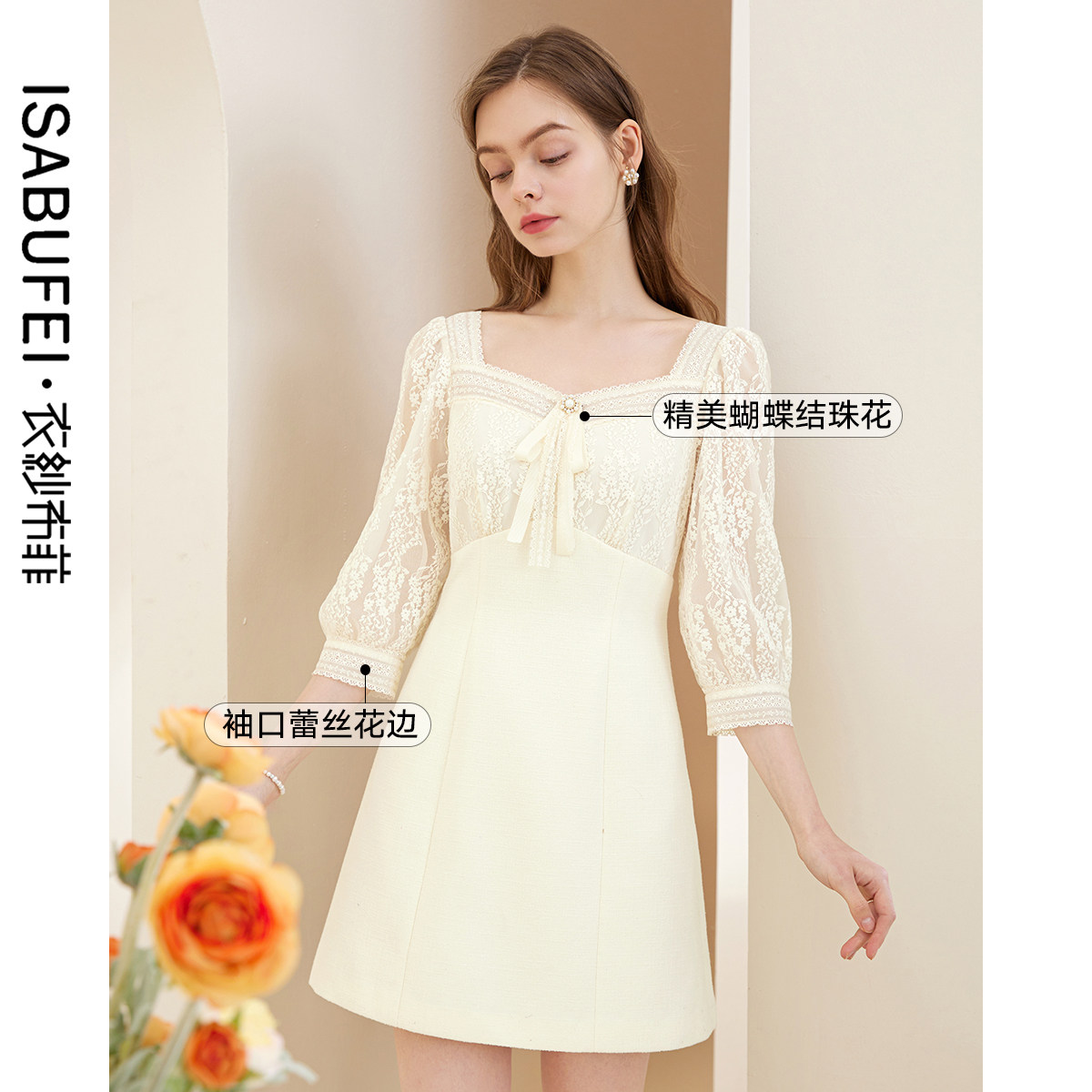 蝴蝶结方领小个子裙子 七分袖 花蕊小香风蕾丝连衣裙夏季 新款