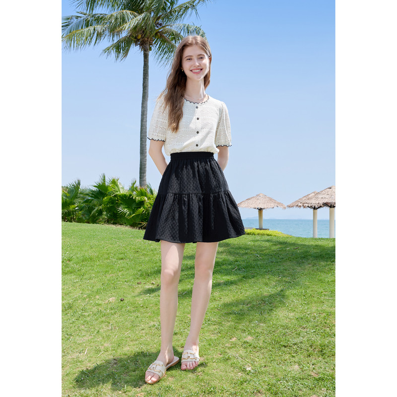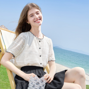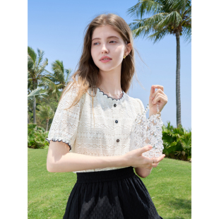 新款 betu百图法式 2025年夏季 女短袖 小香风圆领衬衣 蕾丝花边衬衫