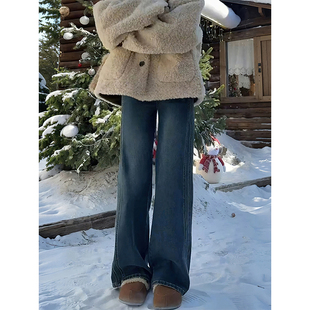 显瘦梨形身材宽松阔腿裤 加绒加厚胖mm大码 女冬季 复古蓝直筒牛仔裤