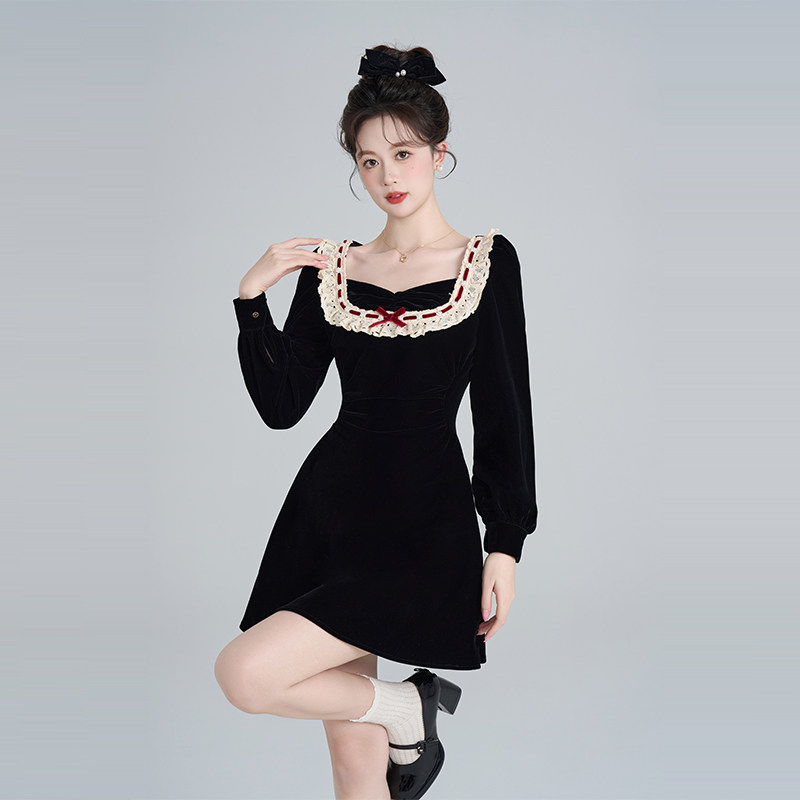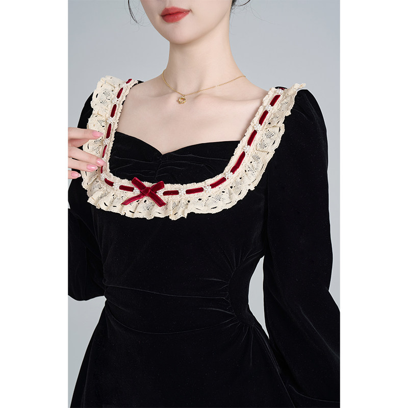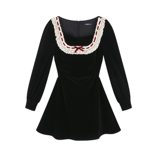 小香风拼接蕾丝黑色丝绒连衣裙女冬装 方领miu系a字裙子 赫本风法式