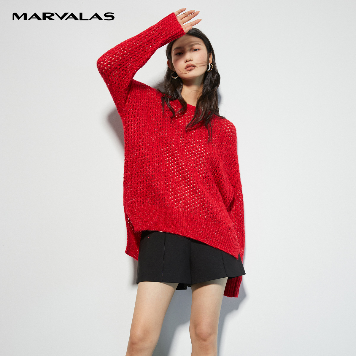 时尚 新款 基础百搭宽松外套 女2025秋装 曼德诗低圆领镂空提花套头衫