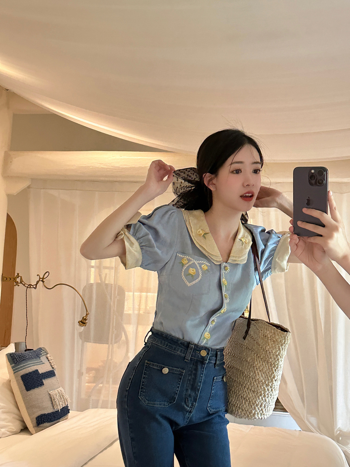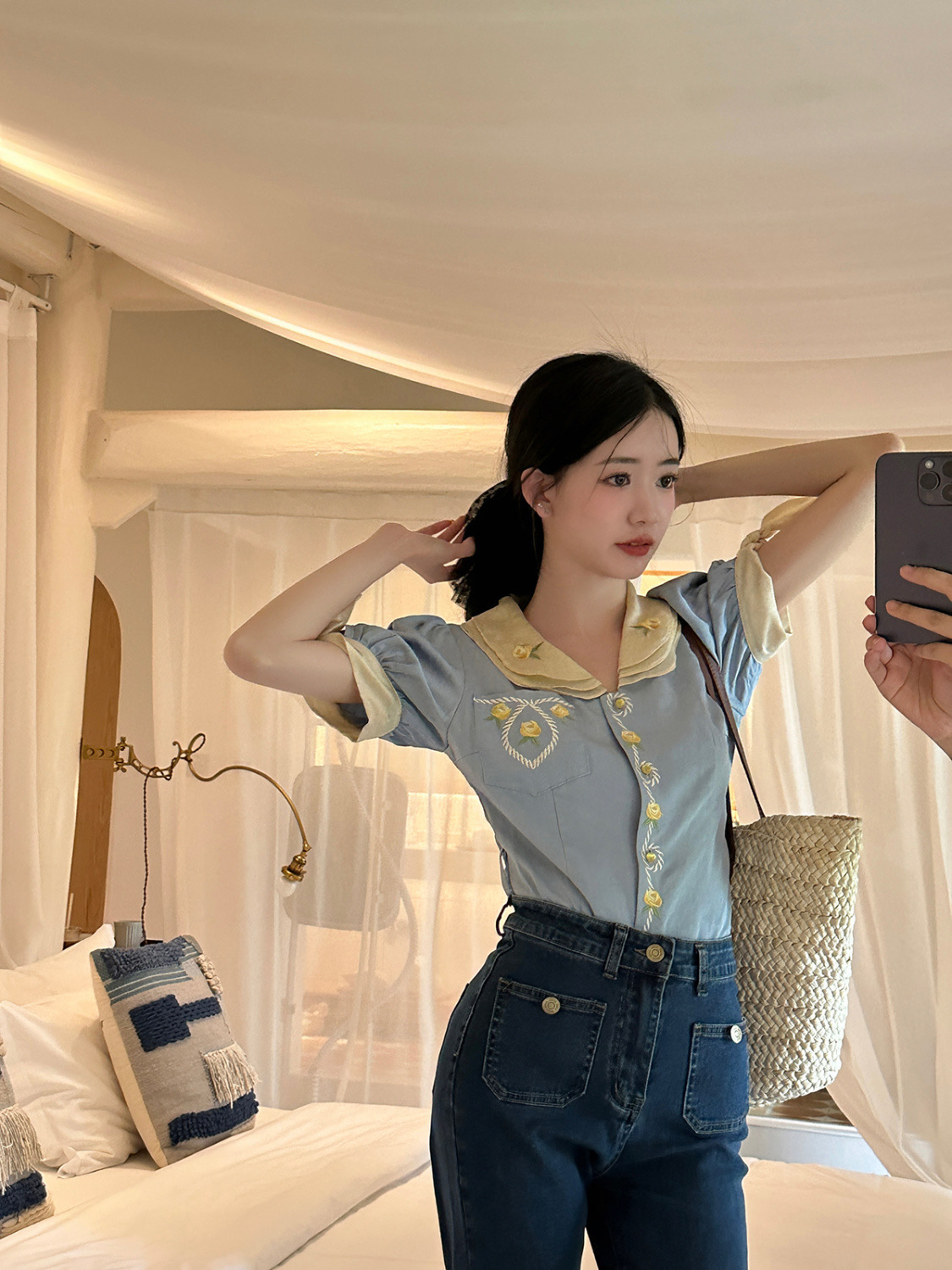 设计感小众百搭通勤上衣 新款 蓝色刺绣棉混纺衬衫 女2024夏季