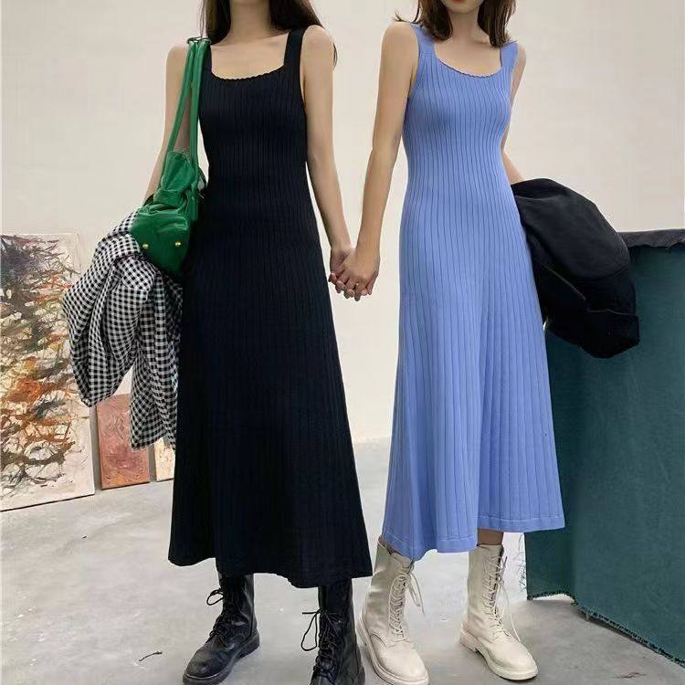 打底性感显瘦背心裙女纯色 韩版 女针织平领吊带裙中长新款 连衣裙装