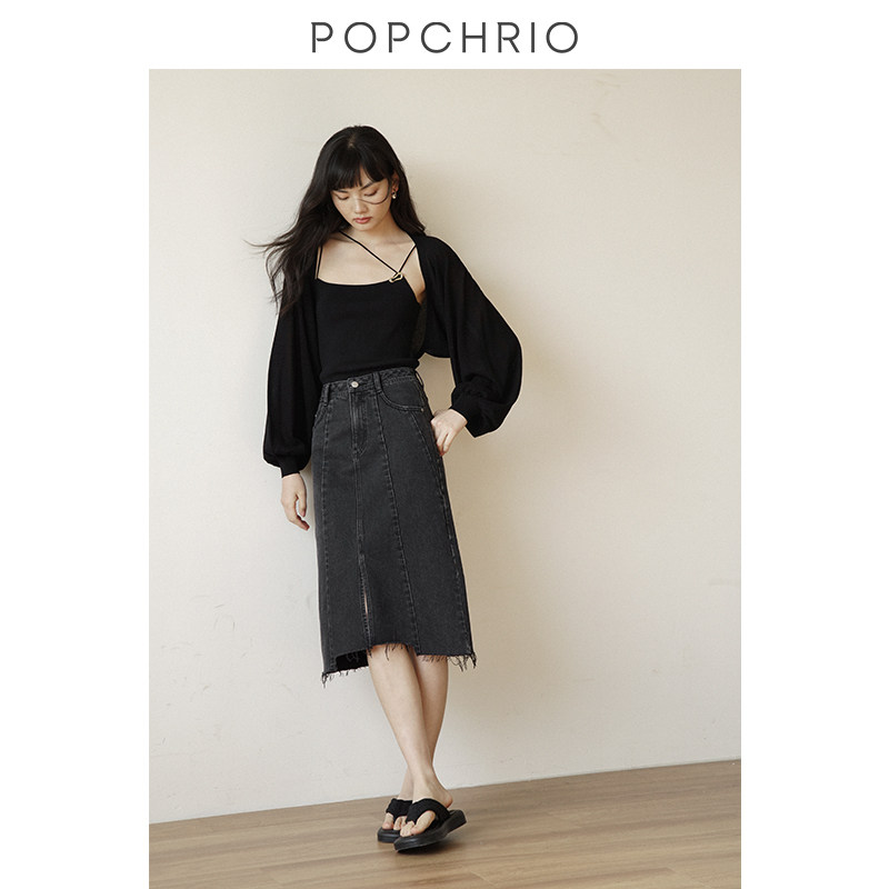 复古时髦不规则设计感开叉牛仔裙高腰显瘦毛边长裙 到手159元