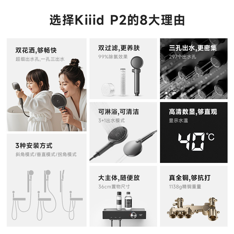 kiiid亲子数显增压净水除氯无顶喷简易沐淋浴花洒套装 家用全铜
