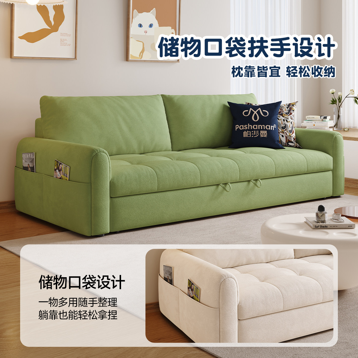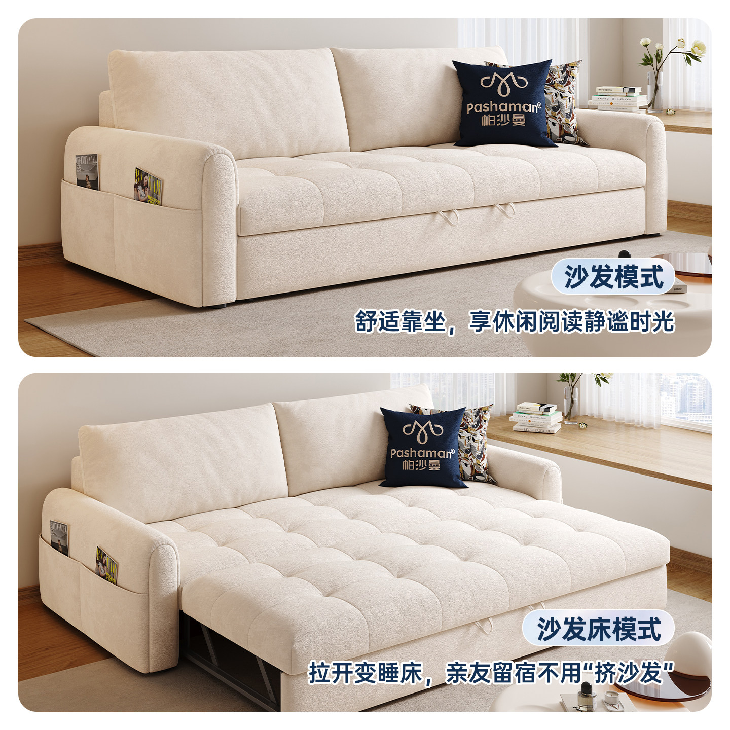帕沙曼 奶油风沙发床布艺棉花糖可折叠客厅小户型多功能储物沙发