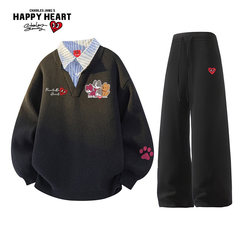 运动套装 休闲裤 假两件衬衫 新款 两件套 领卫衣男春秋季 查尔斯桃心