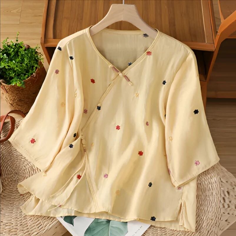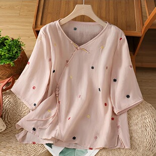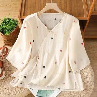 复古斜襟盘扣系带V领五分袖 女夏季 上衣 国风小花刺绣花衬衫 新中式