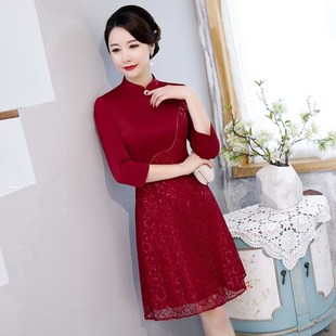 结婚短礼服 喜庆时尚 2020新款 蕾丝拼接酒红旗袍连衣裙改良修身