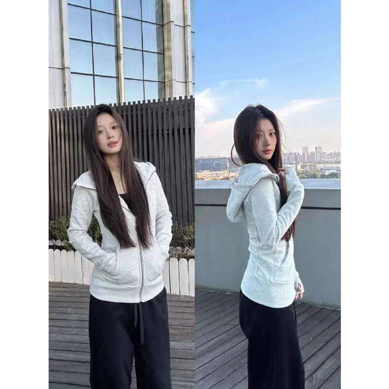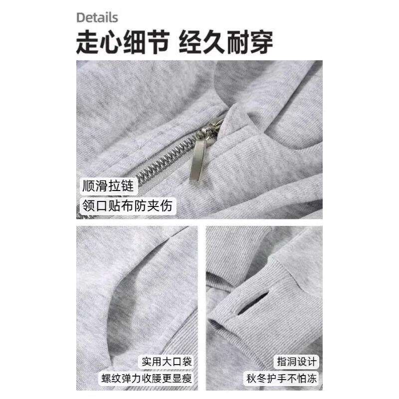 灰色修身 开春穿搭正肩收腰连帽上衣显瘦紧身收腰 卫衣外套女款