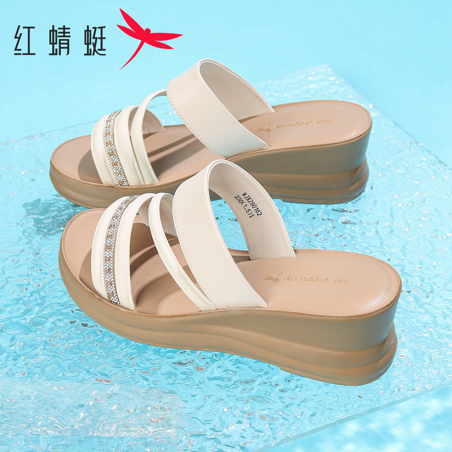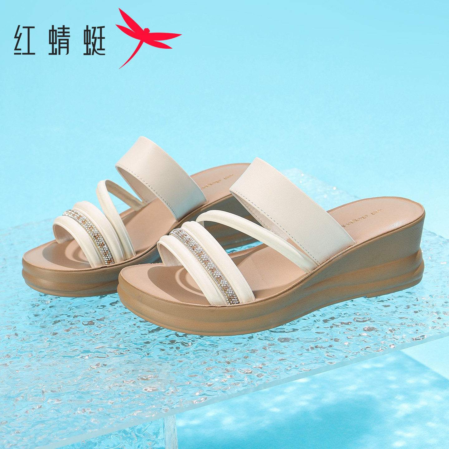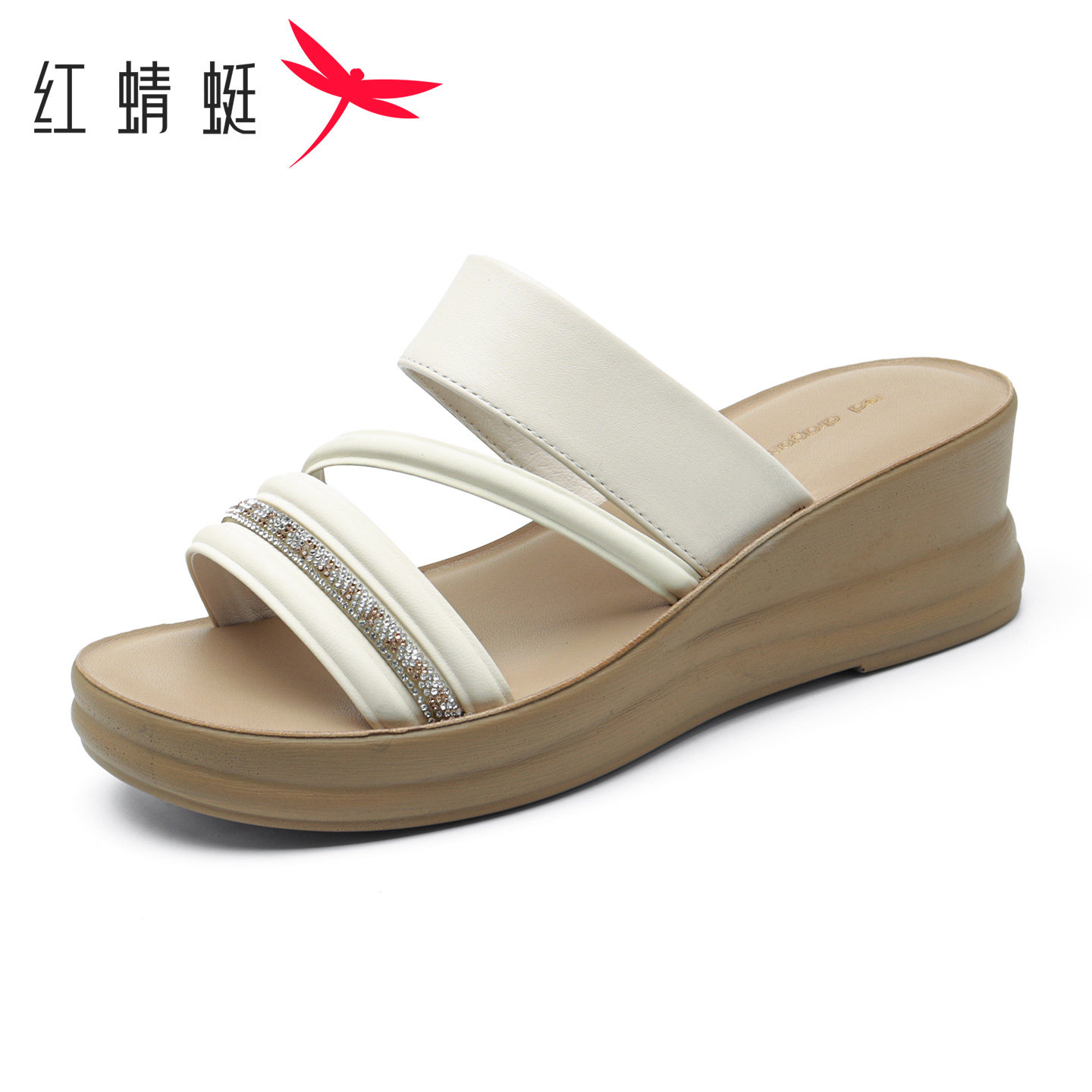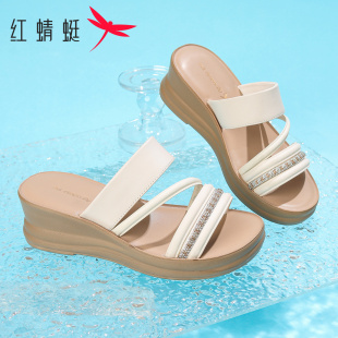外穿厚底坡跟水钻一字拖中年妈妈凉鞋 新款 女2026夏季 红蜻蜓凉拖鞋