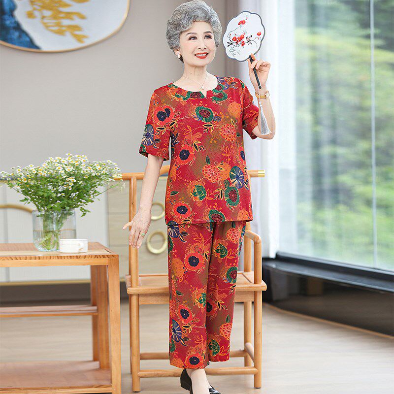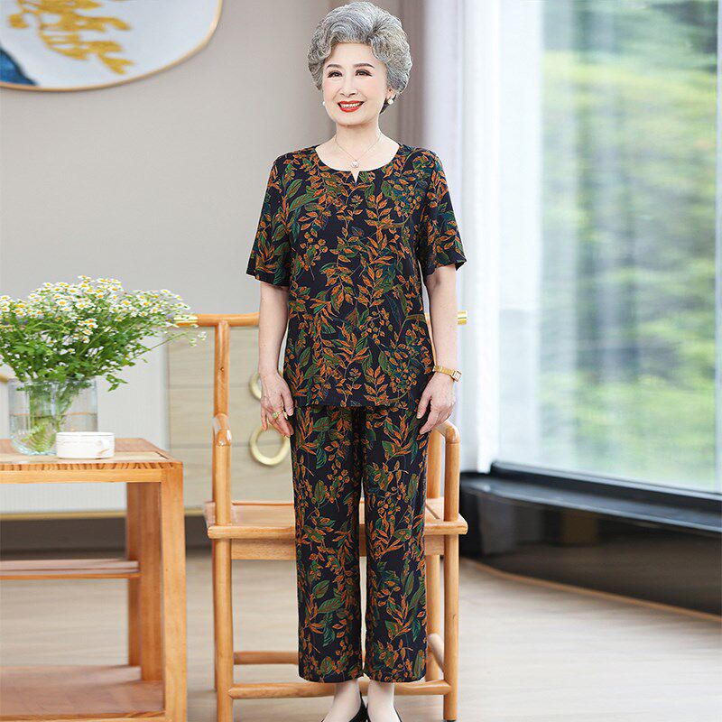 T恤胖妈妈宽松两件套 中老年人女奶奶全棉短袖 老太太夏装 棉绸套装