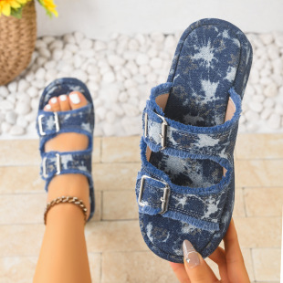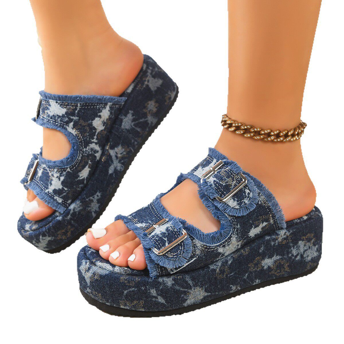 牛仔布带扣一脚蹬外穿厚底罗马凉鞋 女2026夏季 坡跟凉拖鞋 跨境大码