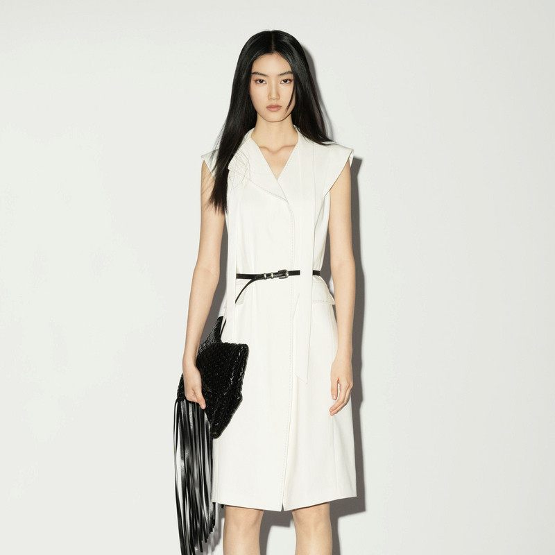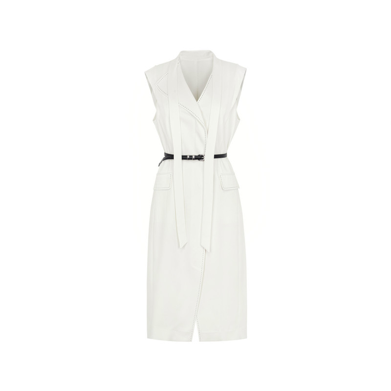 V领连衣裙简约飘带A字伞裙配腰带女 白色无袖 雪歌XL204016A251