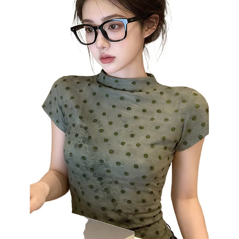 小衫 大码 显瘦薄款 t恤女夏扎染修身 上衣 胖mm复古风半高领波点短袖