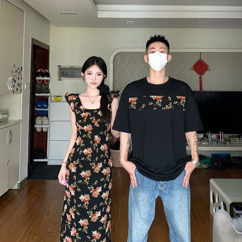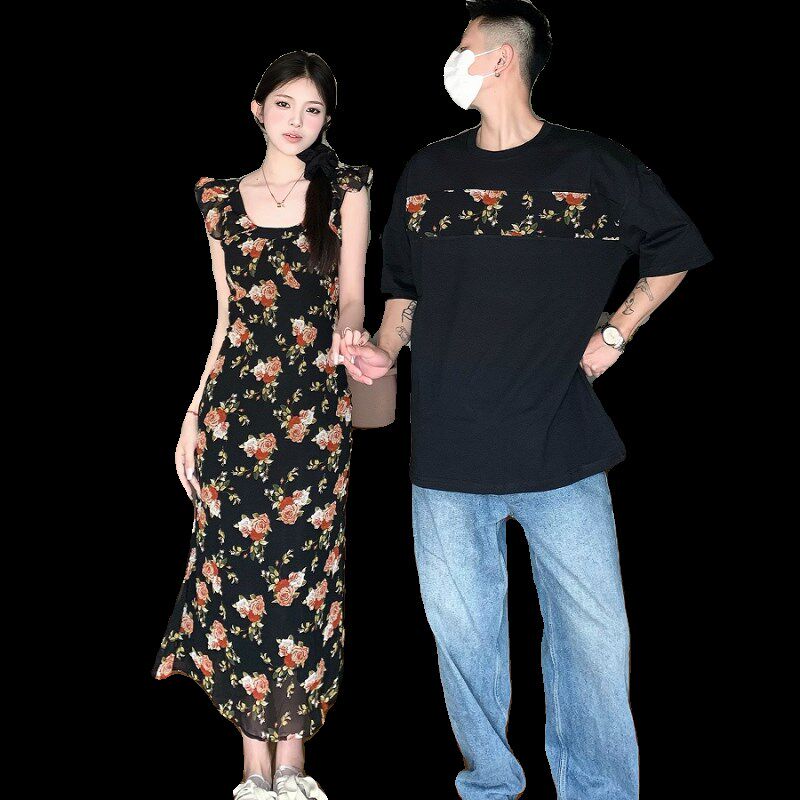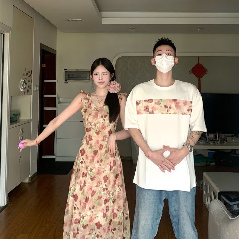 法式 度假风短袖 复古收腰碎花小飞袖 背心连衣裙韩版 T恤 长款 情侣装
