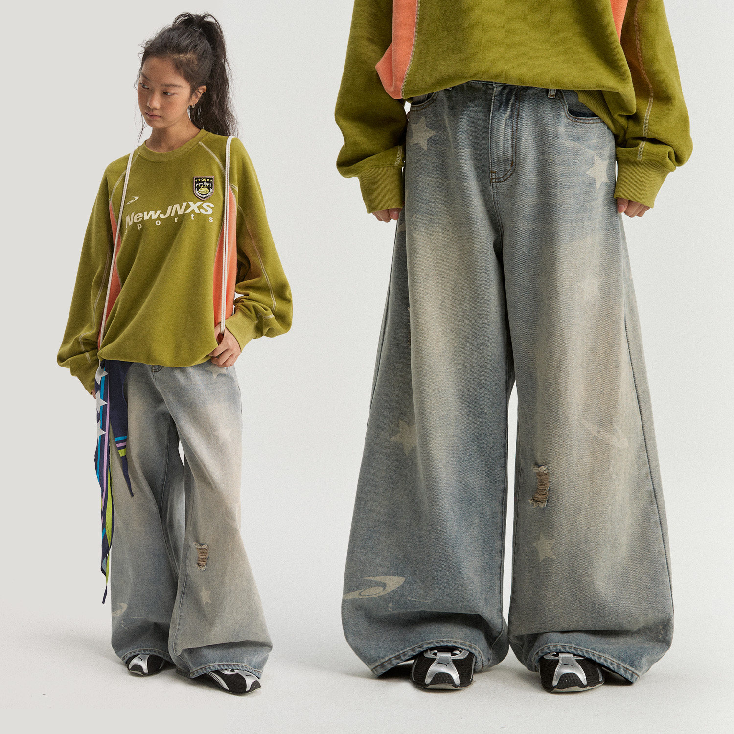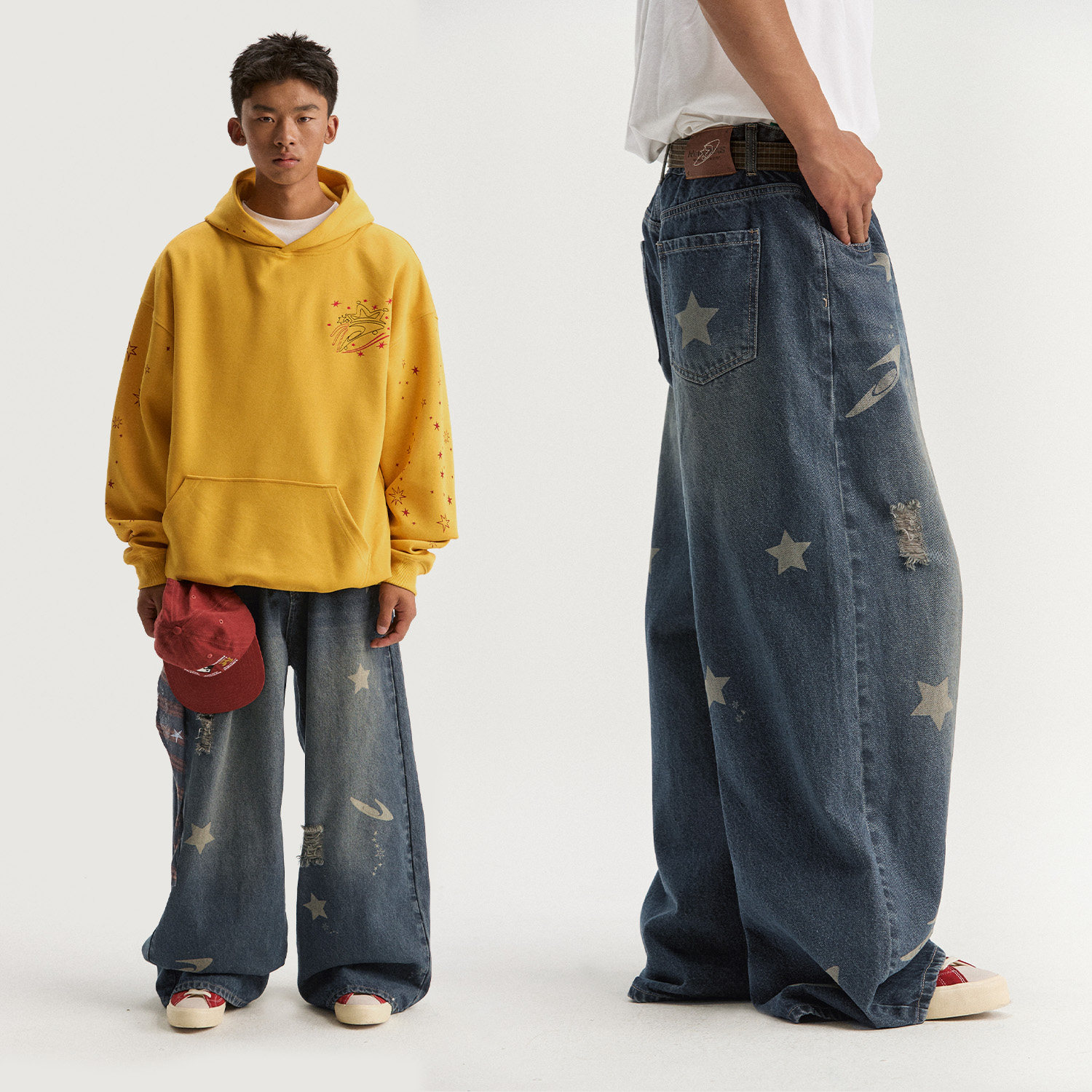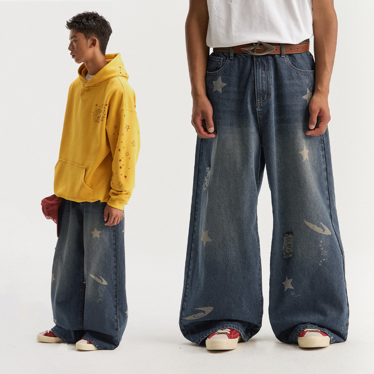 子 秋宽松休闲百搭裤 江南先生NewJNXS美式 复古水印星星斜纹牛仔裤