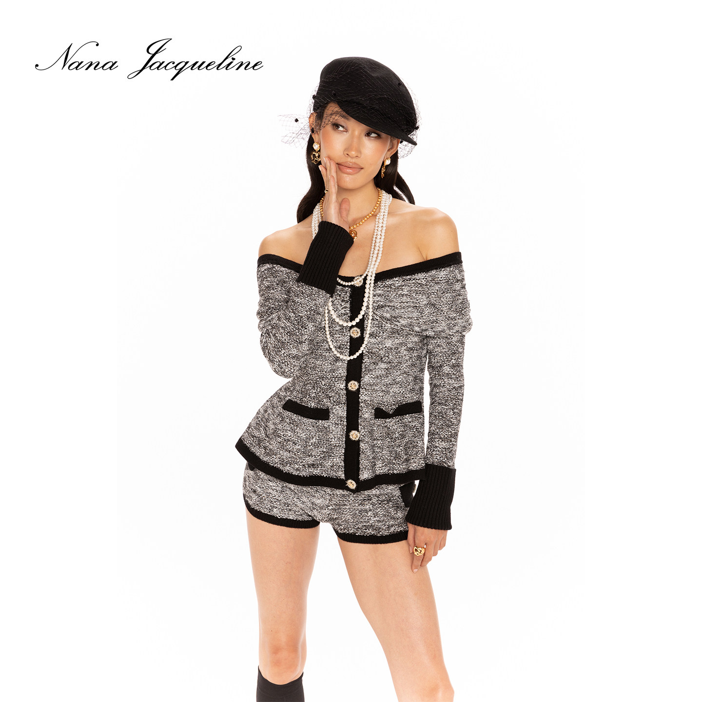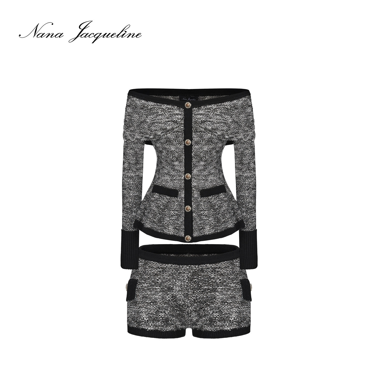 女一字肩上衣配短裤 撞色编织亮丝针织套装 新款 NanaJacqueline春季