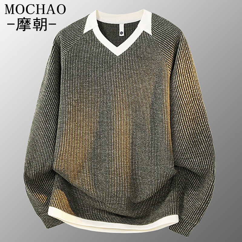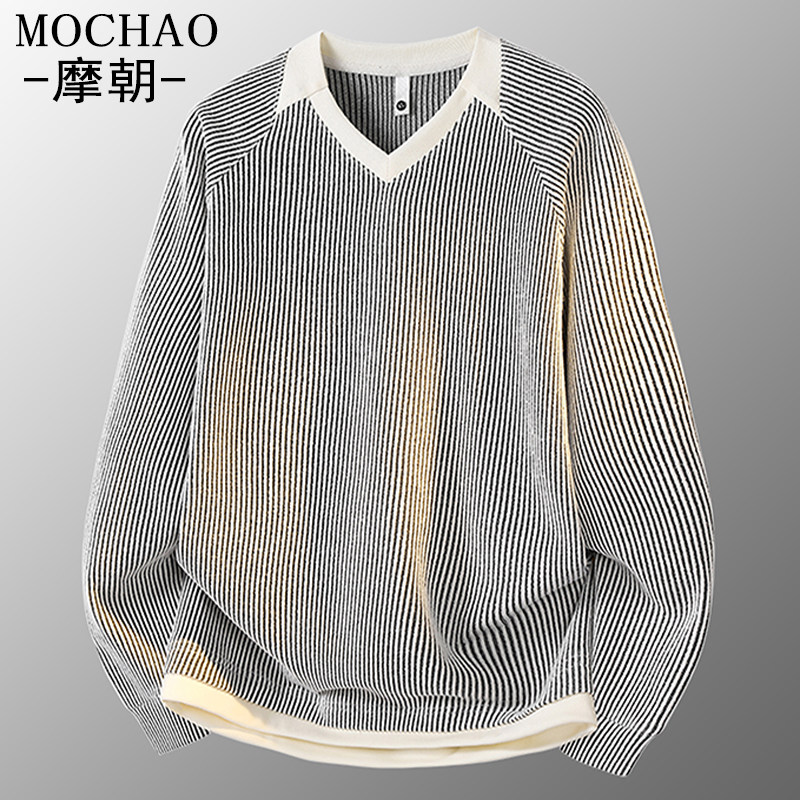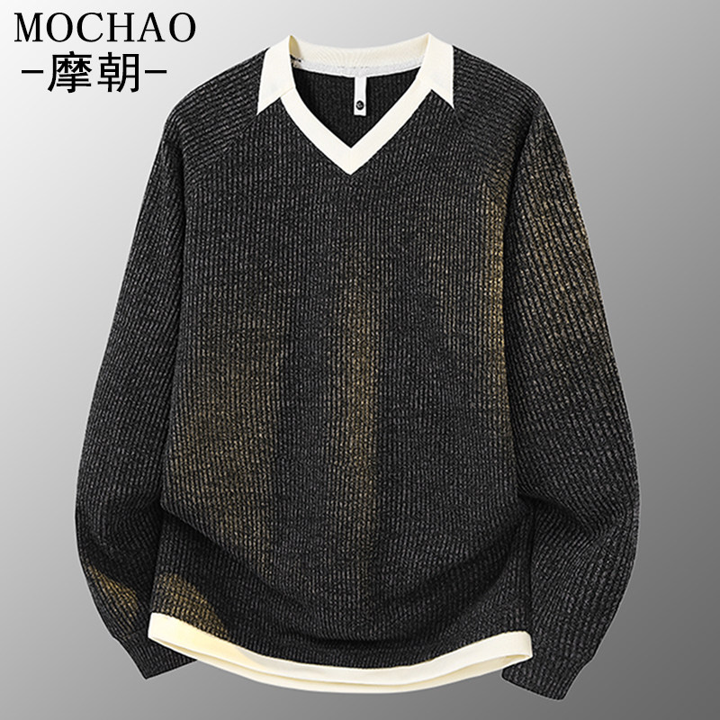 宽松显瘦休闲V领长袖 保暖打底衫 上衣服 卫衣男秋冬款 摩朝潮牌大码