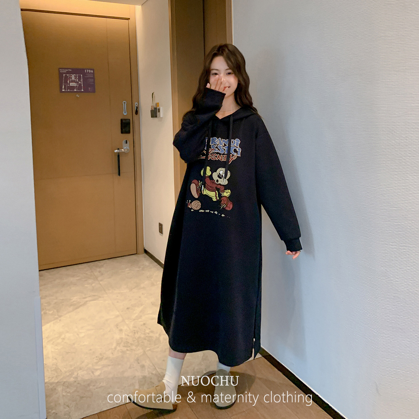 诺初孕妇装 卫衣裙子 连衣裙减龄米奇连帽长裙秋冬加绒休闲纯棉长袖