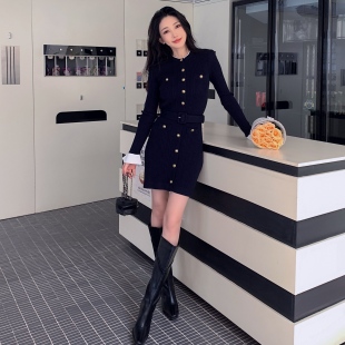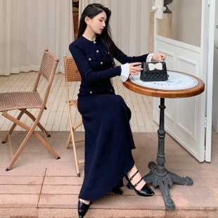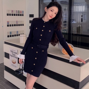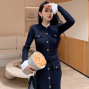 明星杨超越同款 圆领巨好看连衣裙高级弹力针织毛衣裙子 藏蓝色长袖