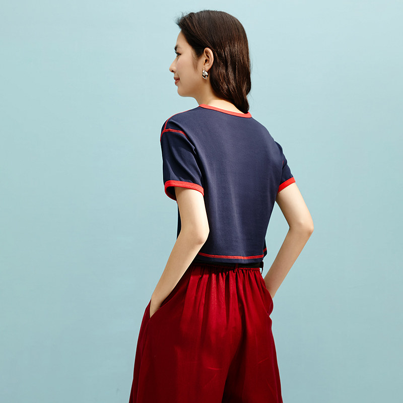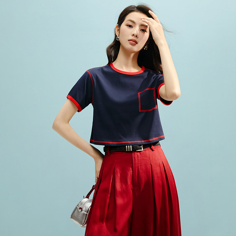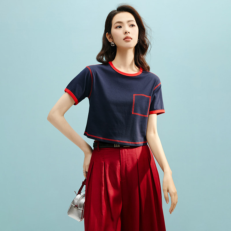 休闲亲肤弹力短款 简约圆领棉料短袖 T恤女 时尚 晚白2026年春新款
