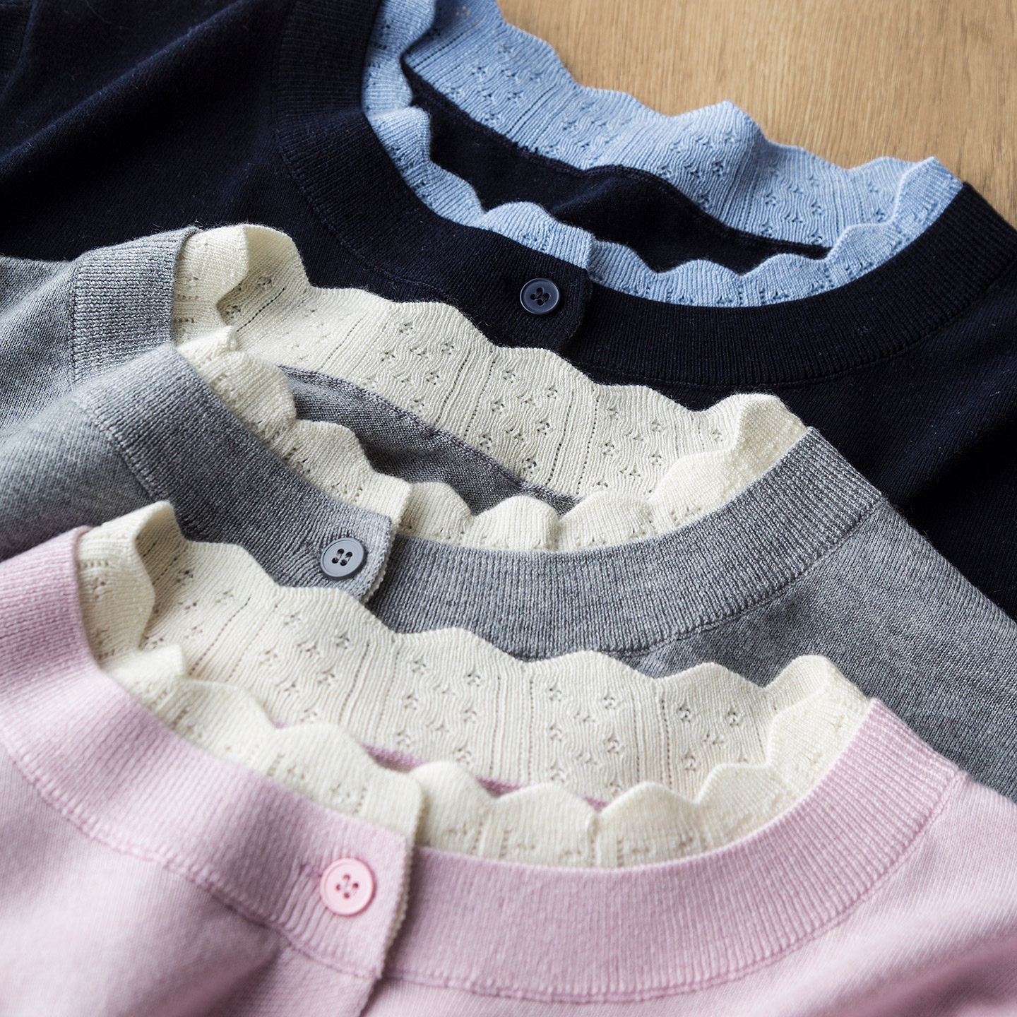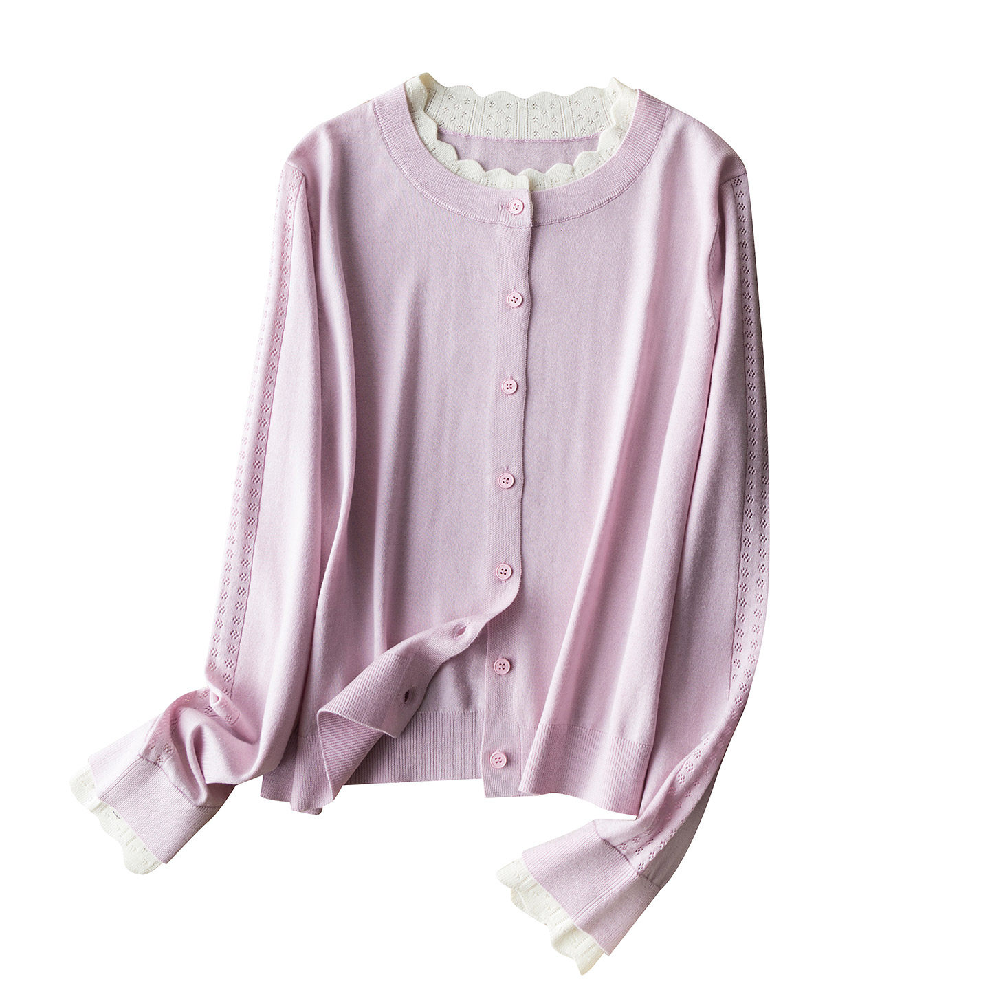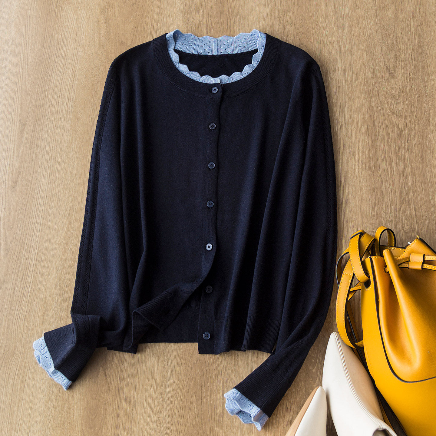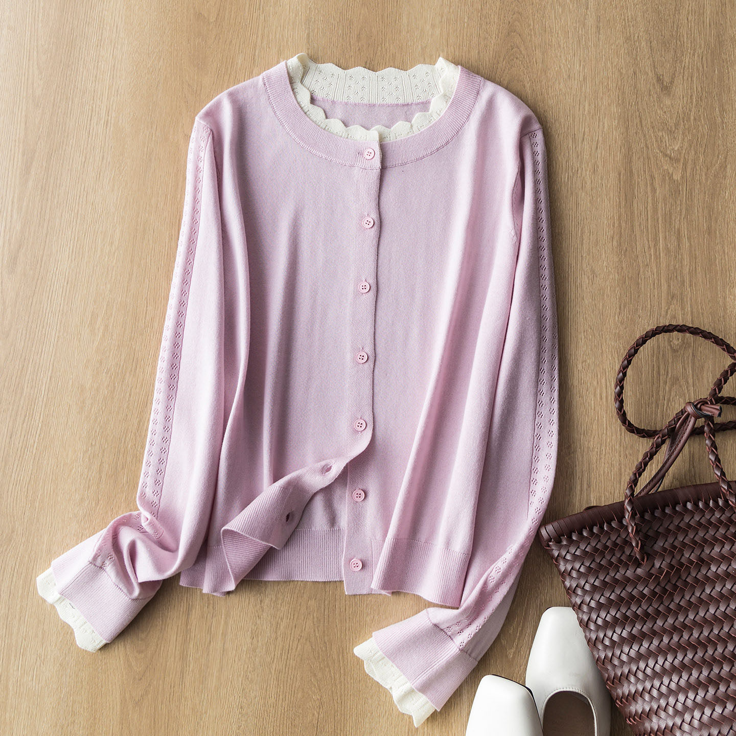 撞色蕾丝花边钩花镂空假两件毛衣开衫 女26早春 桑蚕丝羊毛针织开衫