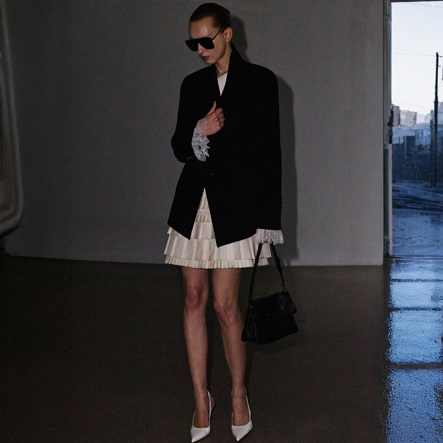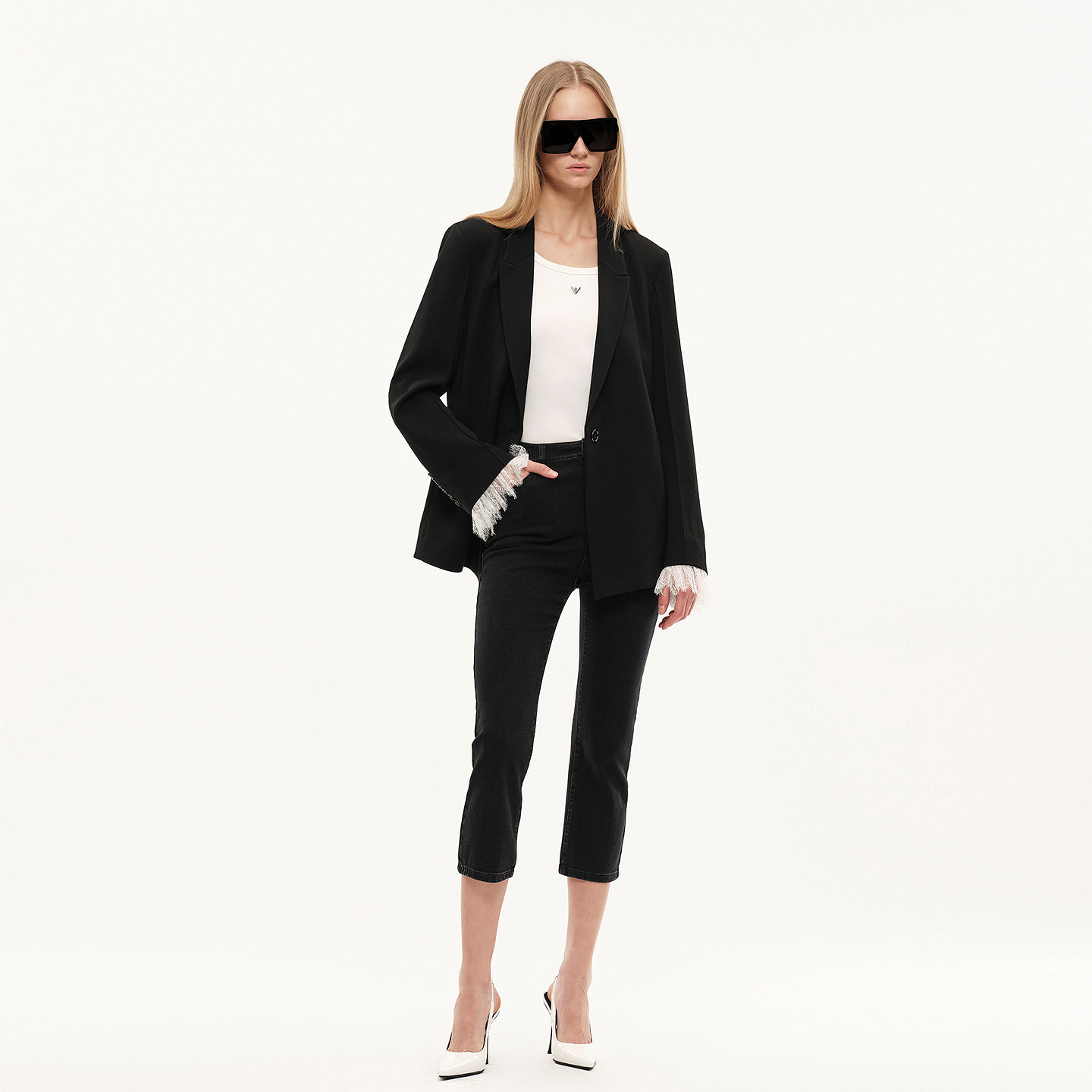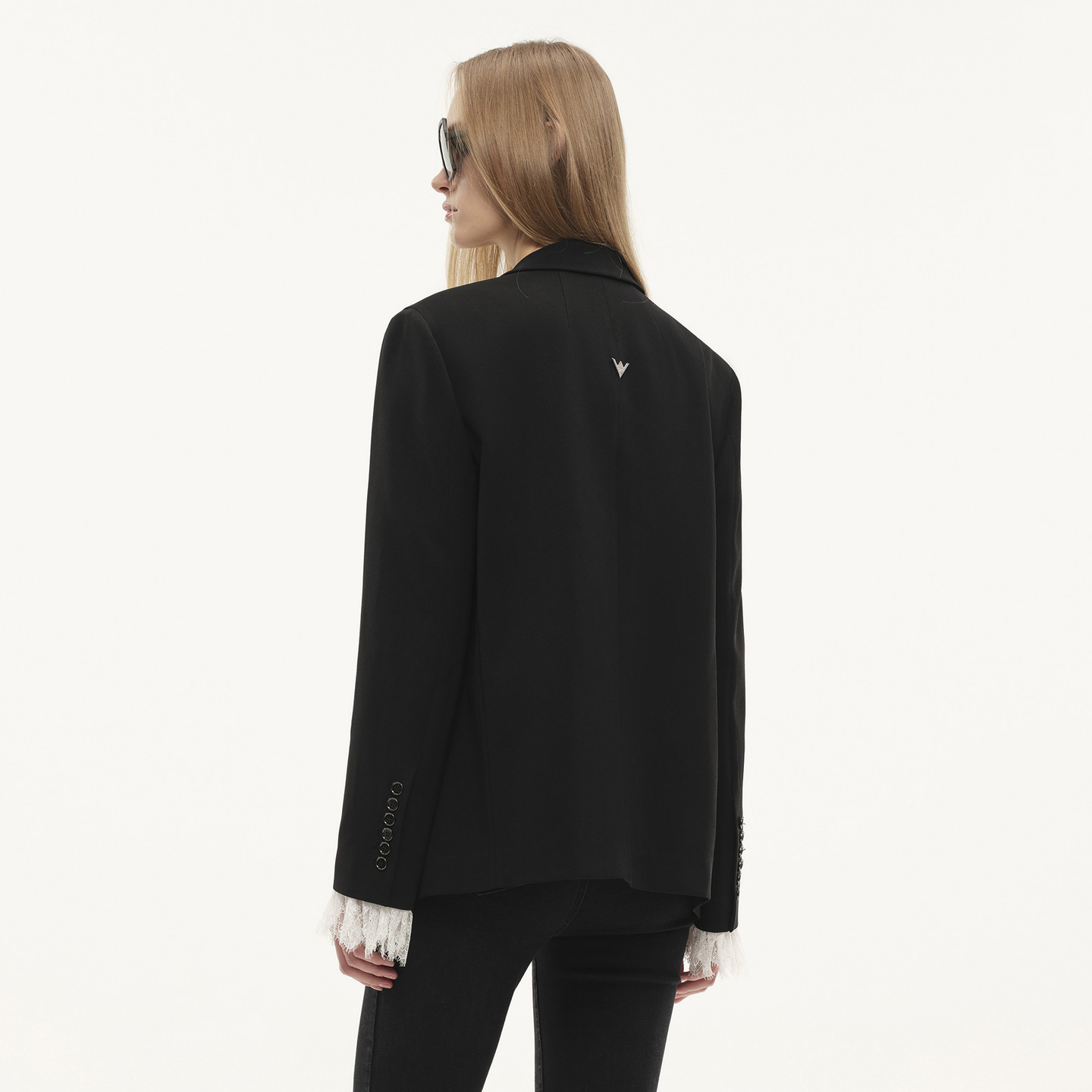 醋酸拼接蕾丝金属徽标轻薄女士黑西装 Fabrique Wang Vera 外套