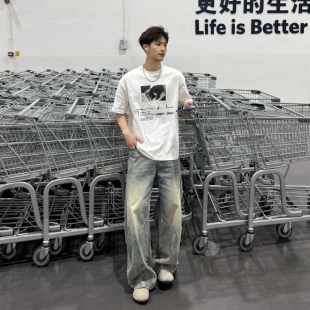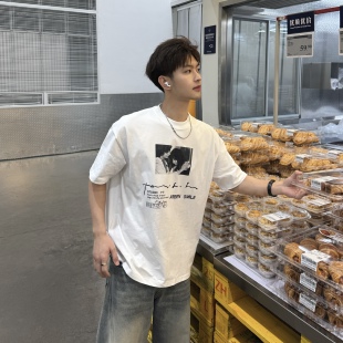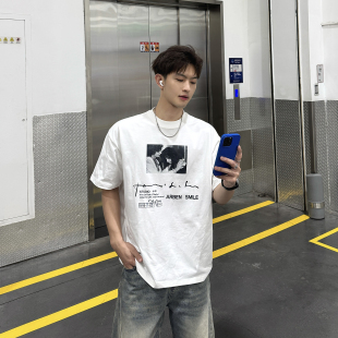 飞型记美式 T恤男纯棉白色百搭圆领上衣 街头风字母人物印花短袖