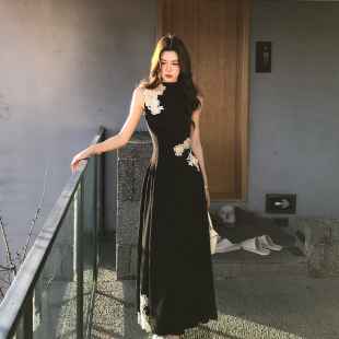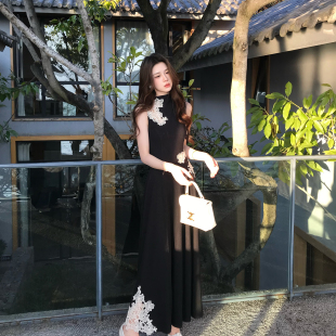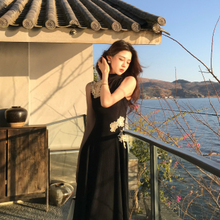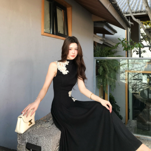 蕾丝刺绣针织连衣裙垂感高腰A字长裙夏 立领无袖 木子李 李新中式