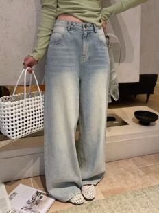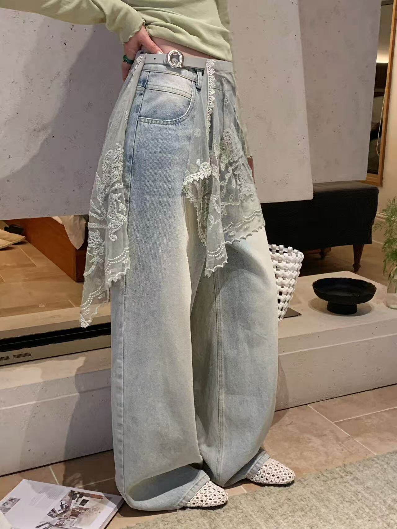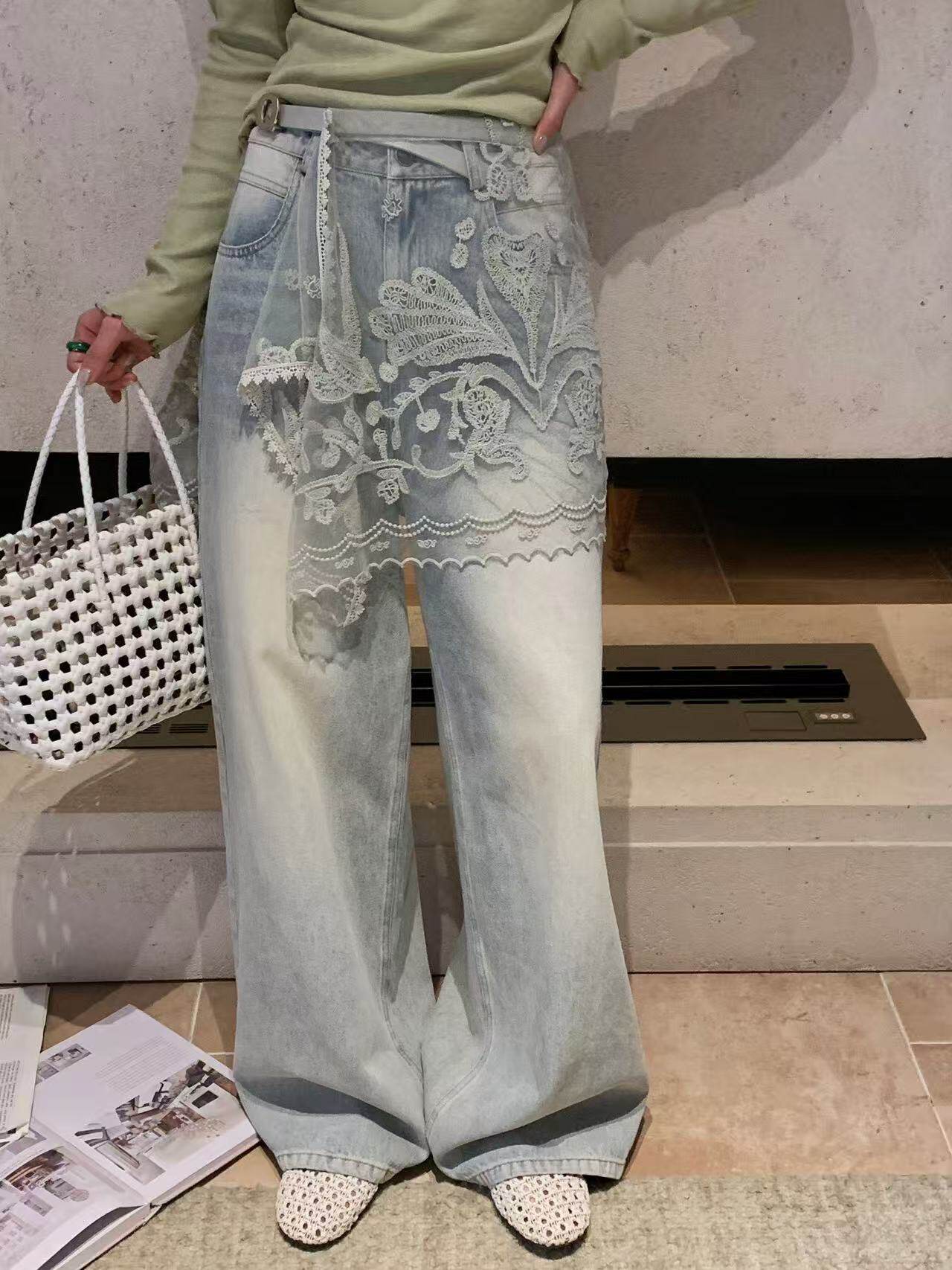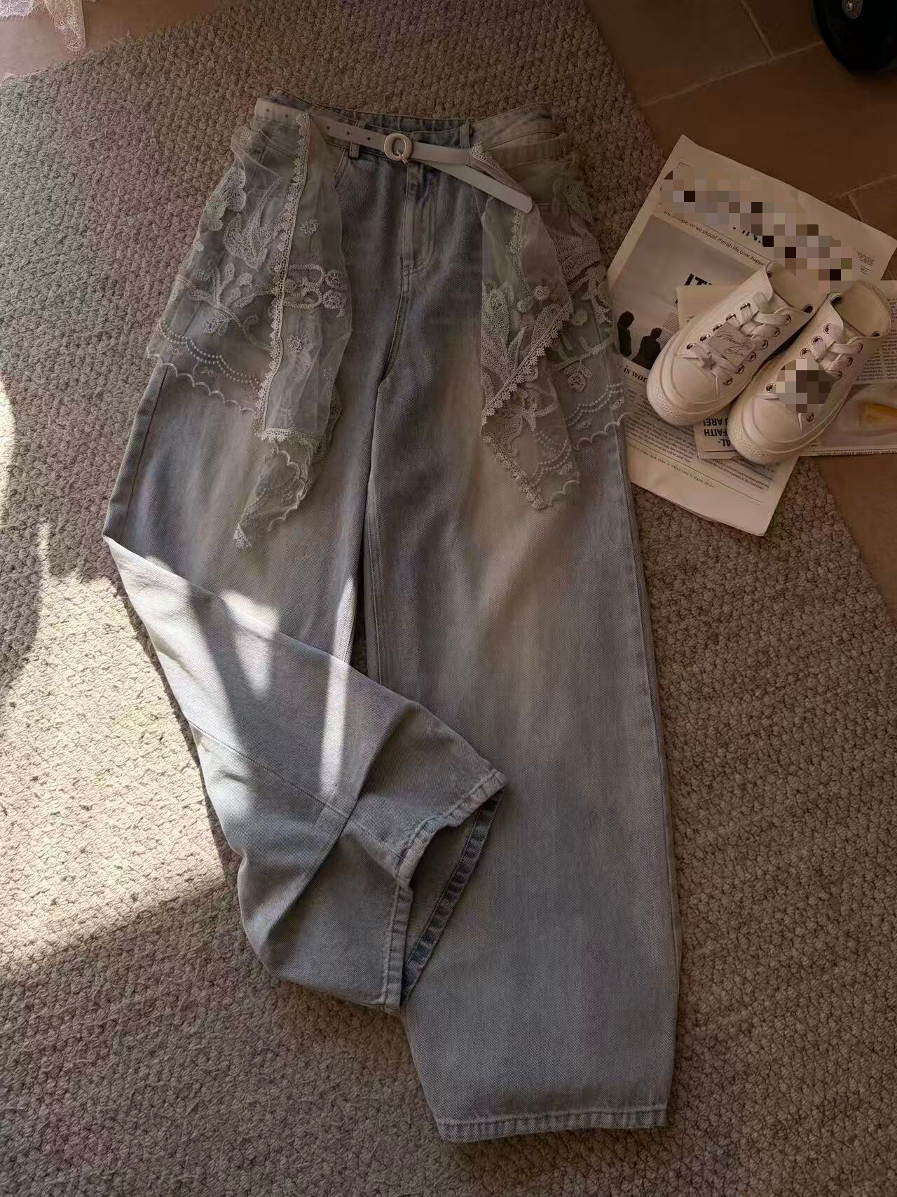 高腰显瘦阔腿裤 欧洲站2026春季 .com设计感蕾丝屁帘牛仔裤 女 新款