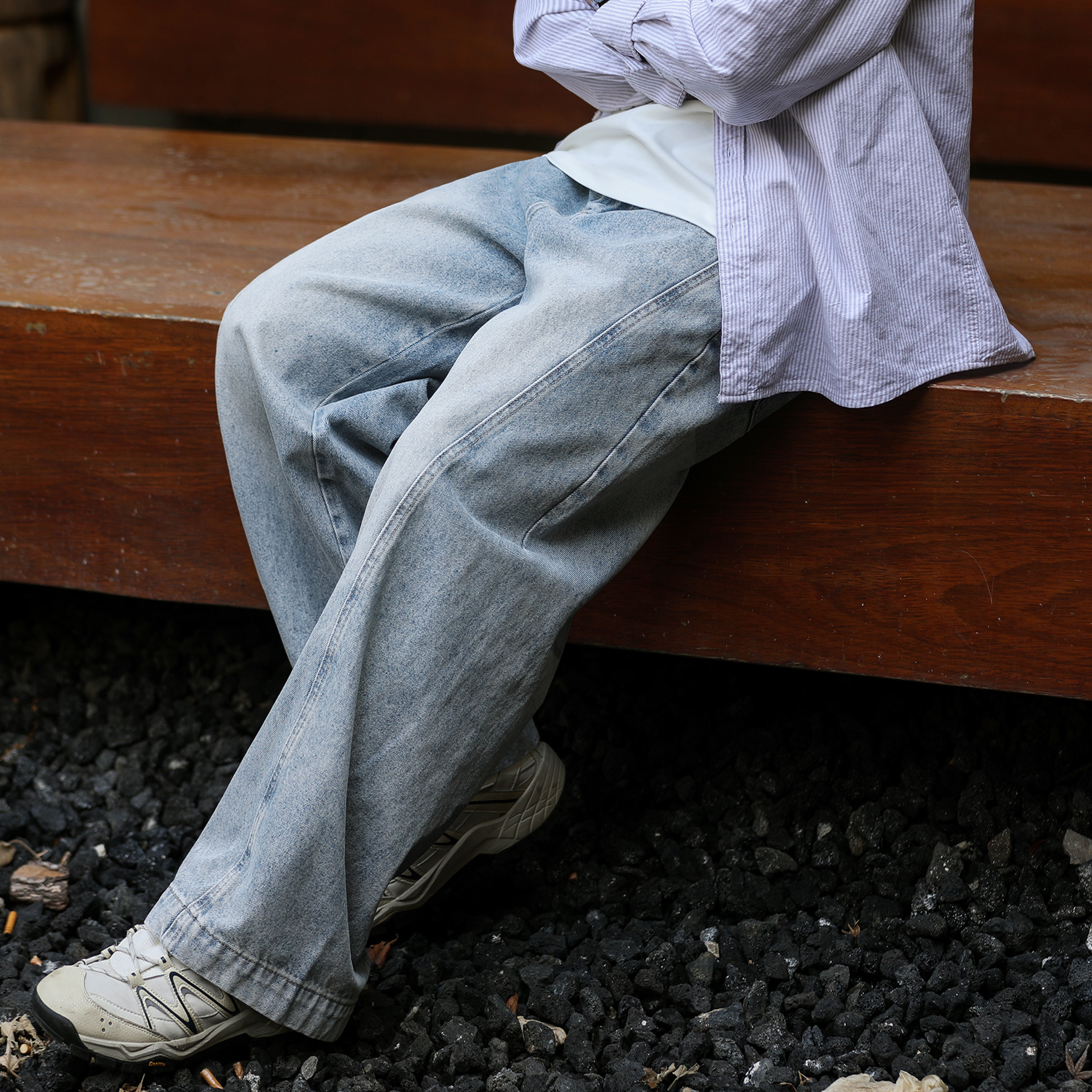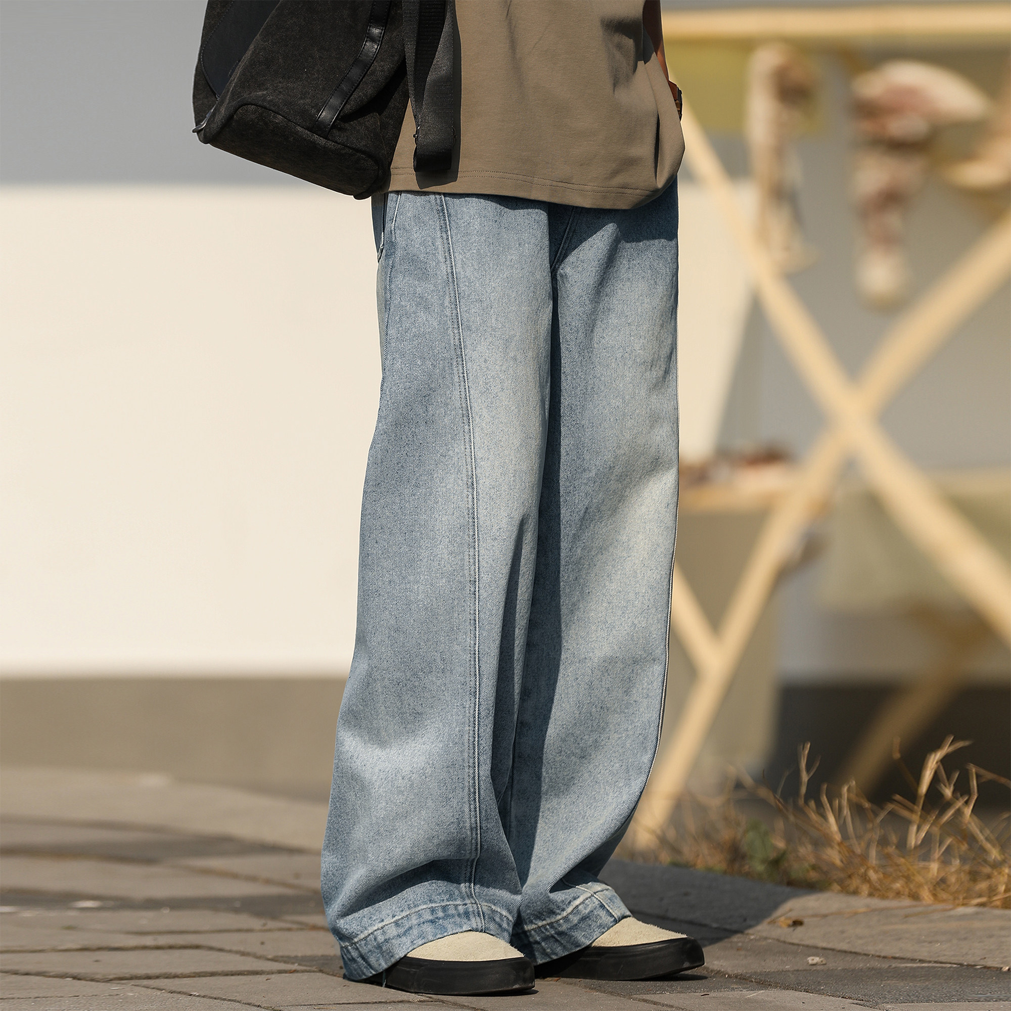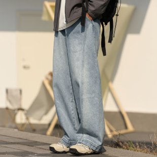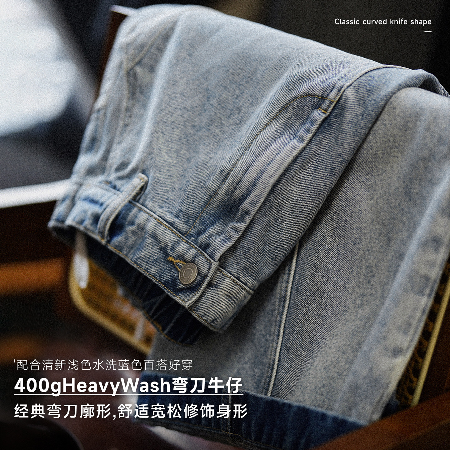 子男 弯刀阔腿休闲裤 400G重磅嘿马七作美式 春秋浅蓝色水洗牛仔长裤