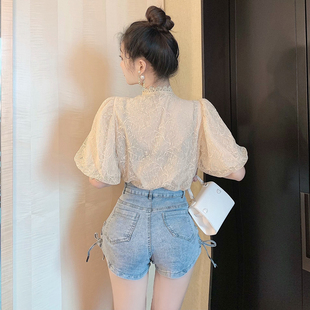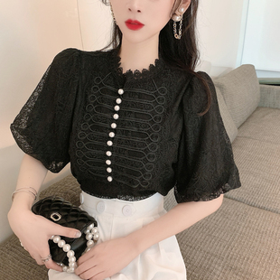 设计感小众钉珠雪纺衬衫 法式 新款 蕾丝上衣女2025年夏季 气质泡泡袖