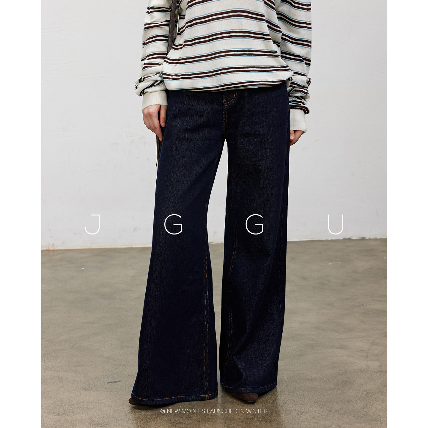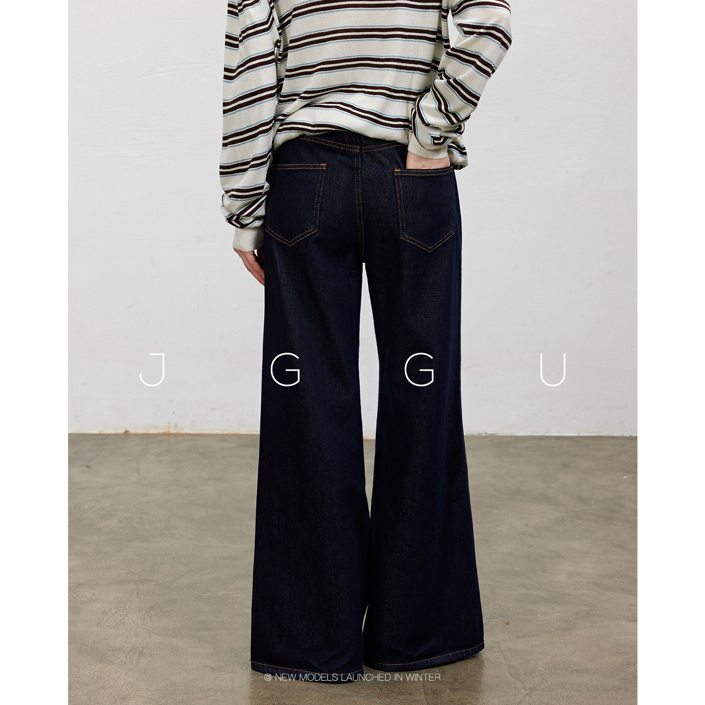 晶咕黑标JGGU双腰带复古水洗原色宽松阔腿牛仔裤 子 女秋冬显瘦裤