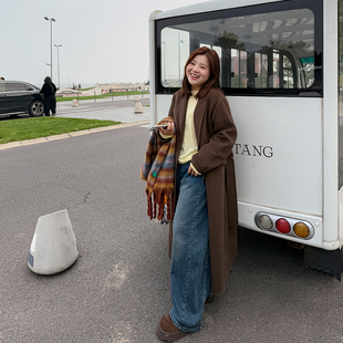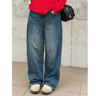 女 百搭宽松阔腿裤 猫猫家加长女裤 秋冬加绒加厚雅痞直腰抓须牛仔裤