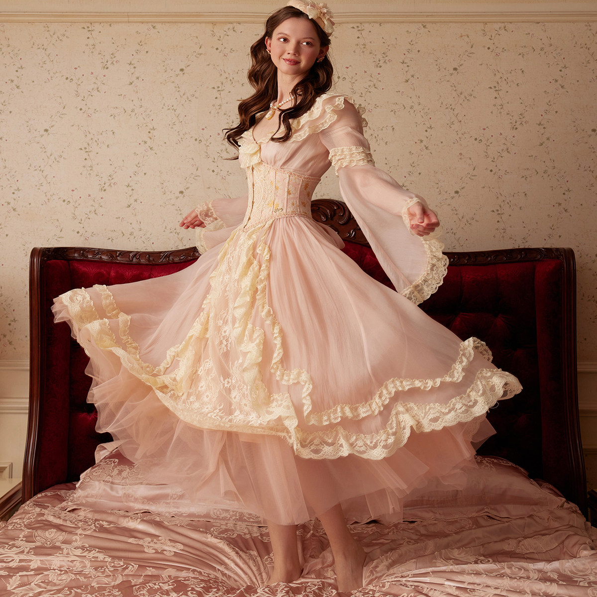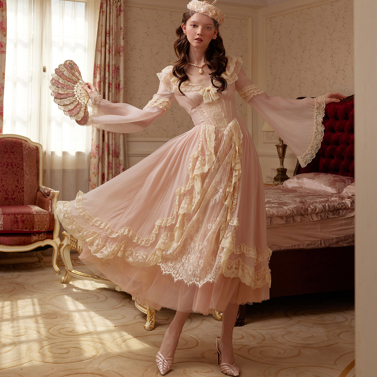 宫廷复古蕾丝粉色喇叭袖 法式 仙女鱼骨连衣裙鱼 仙梦公主 LaceMade