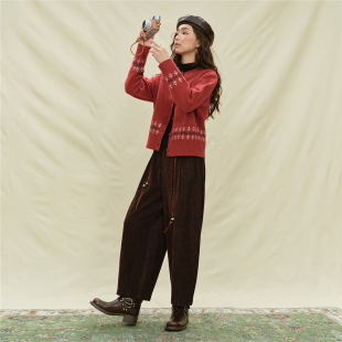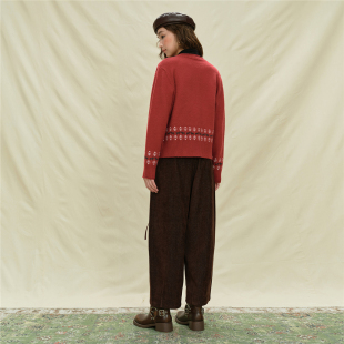 设计师款 18355614 佐丹奴红色毛衣女撞色提花卷边宽松圆领针织开衫